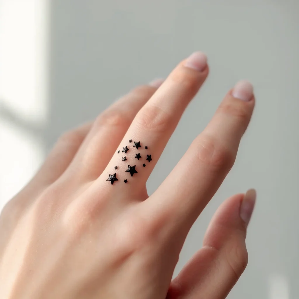 I usually recommend starting with three to five tiny stars scattered across one or two fingers. You can always add more later (tattoo addiction is real, friends). Some people create a trail of stars from their knuckle down to their nail bed, while others prefer a concentrated cluster on the side of their finger.