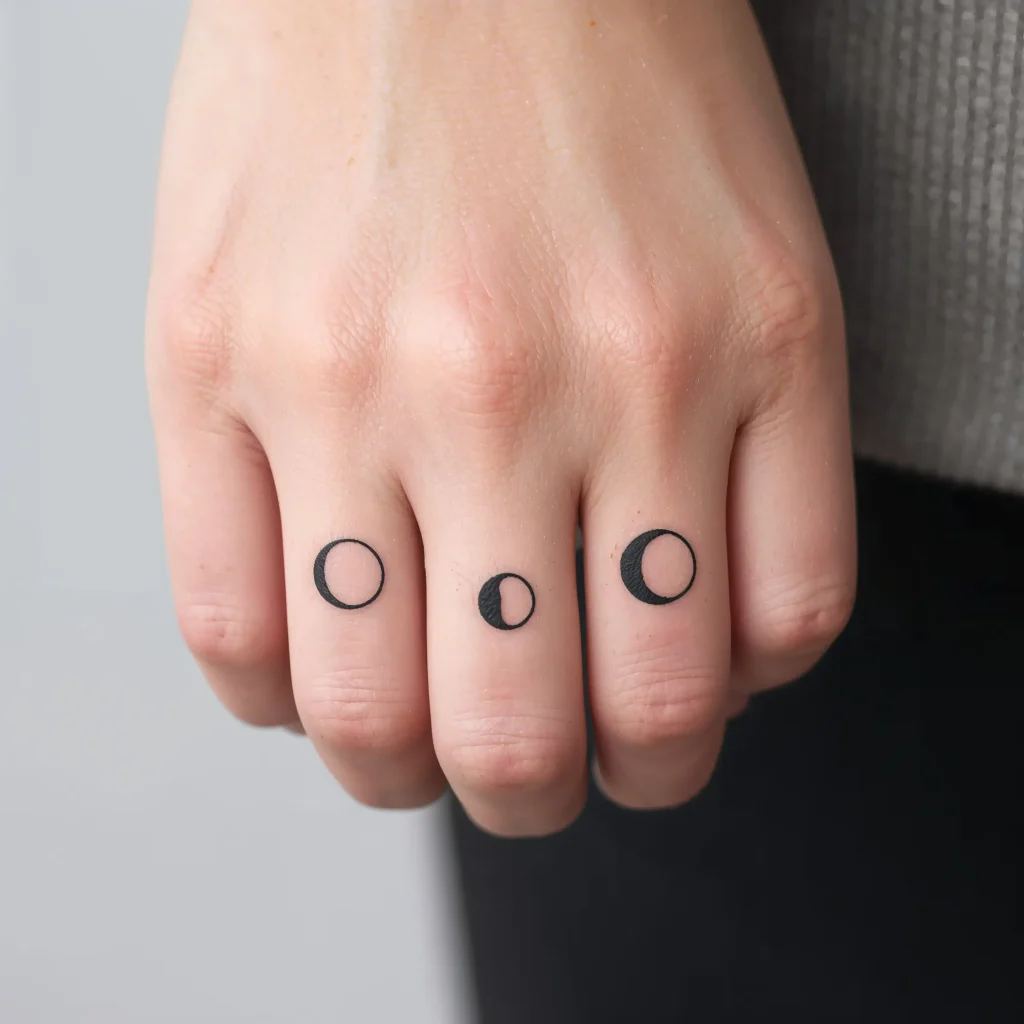 The typical design features the moon in its various phases lined up across your finger. You can go full lunar cycle or just pick your favorites. New moon, waxing crescent, full moon – each phase can represent different aspects of your personality or life journey. Deep stuff for such tiny tattoos, right?