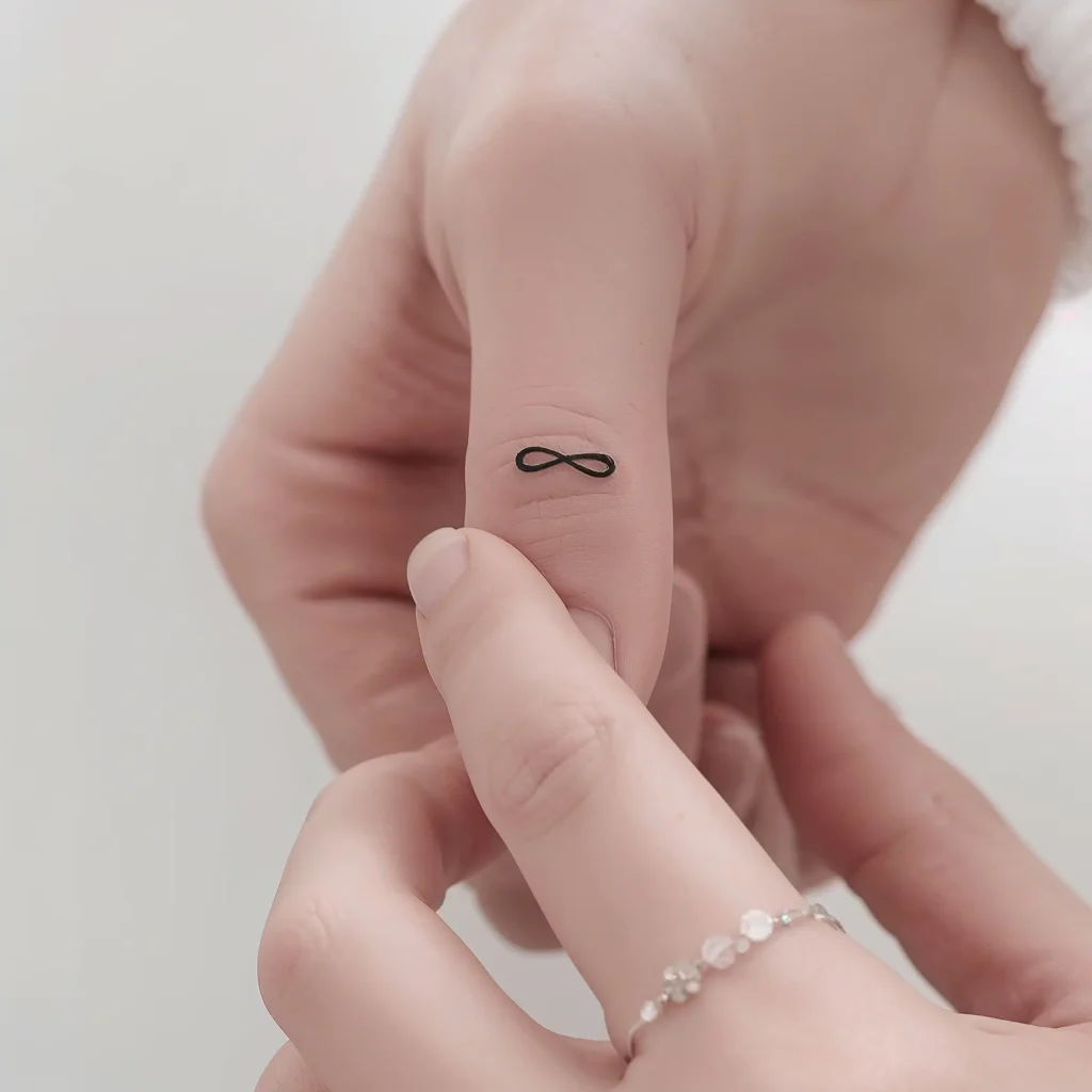 The infinity symbol might seem overdone, but when it comes to finger tattoos, it’s actually perfect. That simple figure-eight shape fits naturally on the finger’s narrow canvas, and it carries whatever meaning you want to give it.