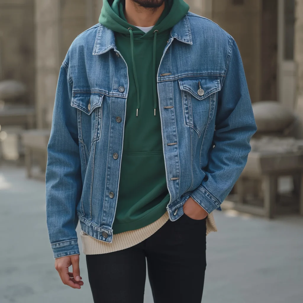Here’s what works best: choose a slightly oversized denim jacket so your hoodie fits comfortably underneath. Let that hood peek out from the collar – it adds dimension and makes the whole thing look intentional. Light wash denim with sage green? Chef’s kiss. Dark wash with forest green? Equally stunning.