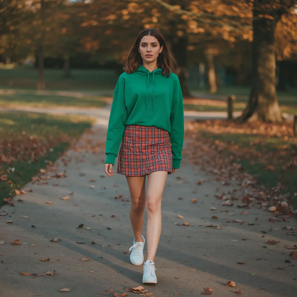Now here’s where things get interesting. The preppy-meets-street combo of a green hoodie with a plaid skirt? Absolute fire. I stumbled upon this pairing when I was running late and just grabbed whatever, and let me tell you – best accident ever.