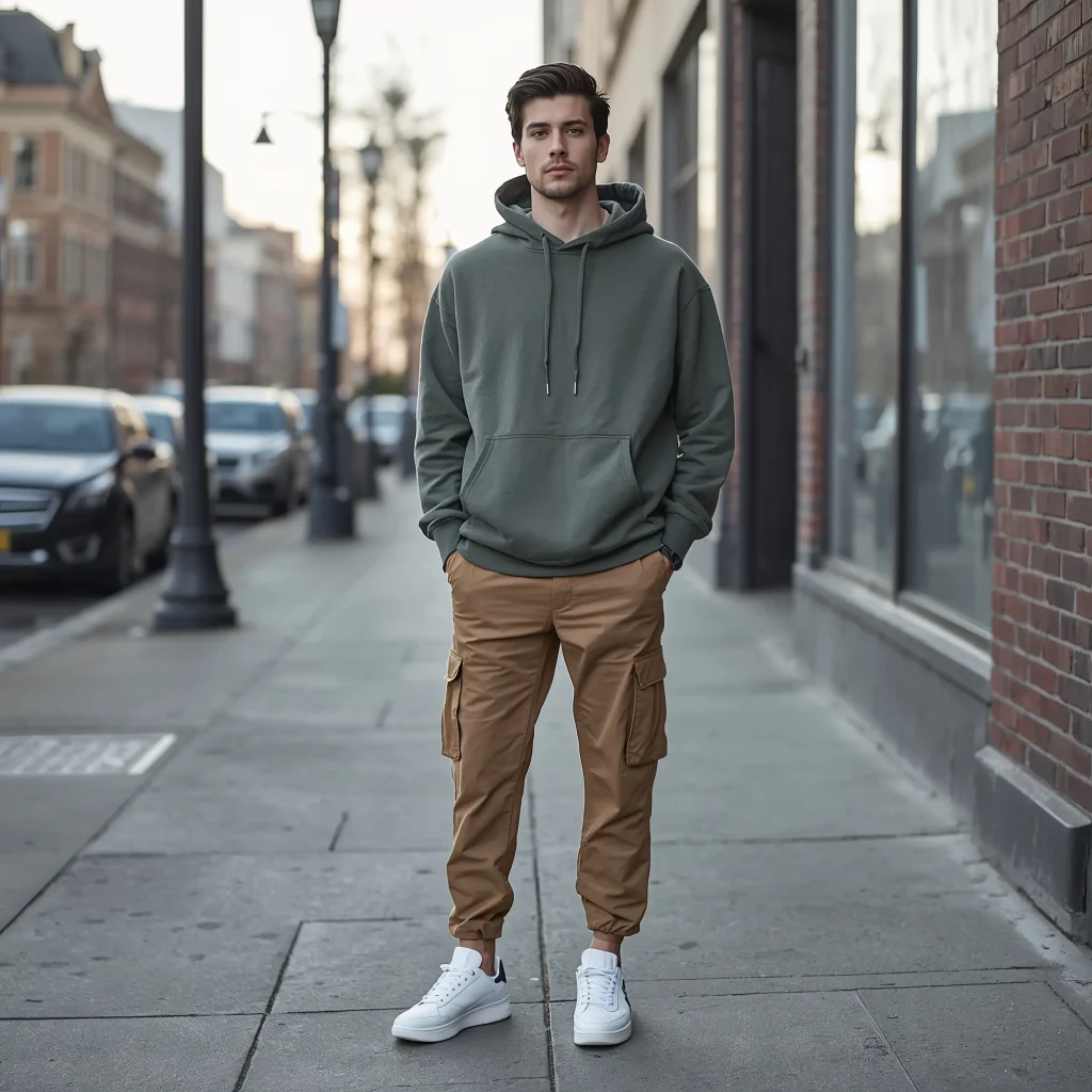 This is where your green hoodie truly shines – streetwear is its natural habitat. I love pairing my olive green hoodie with black cargo pants and chunky white sneakers for that effortlessly cool vibe. The key here? Balance your proportions.