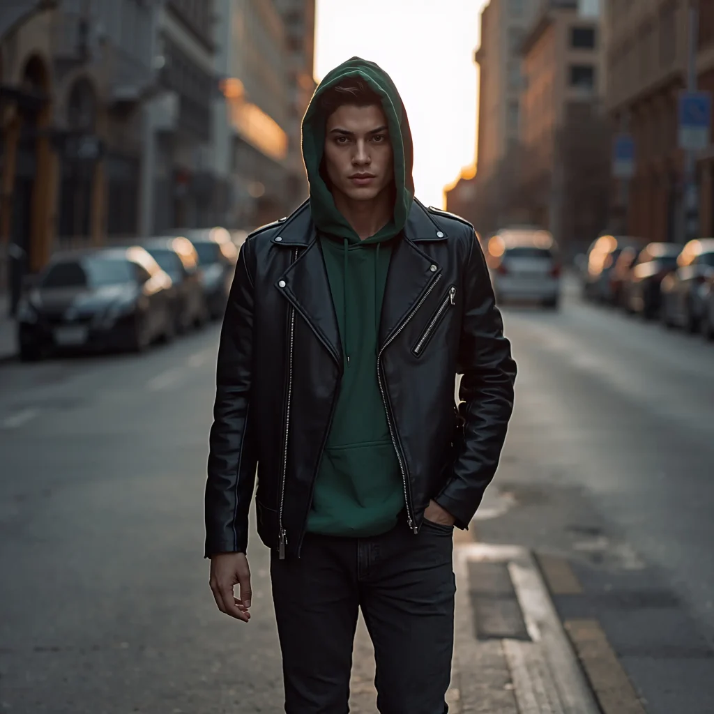 Want to look like you stepped out of a magazine? Layer your green hoodie under a leather jacket. This combination brings together soft and tough, casual and edgy, comfortable and cool. The textural contrast alone makes this outfit interesting.