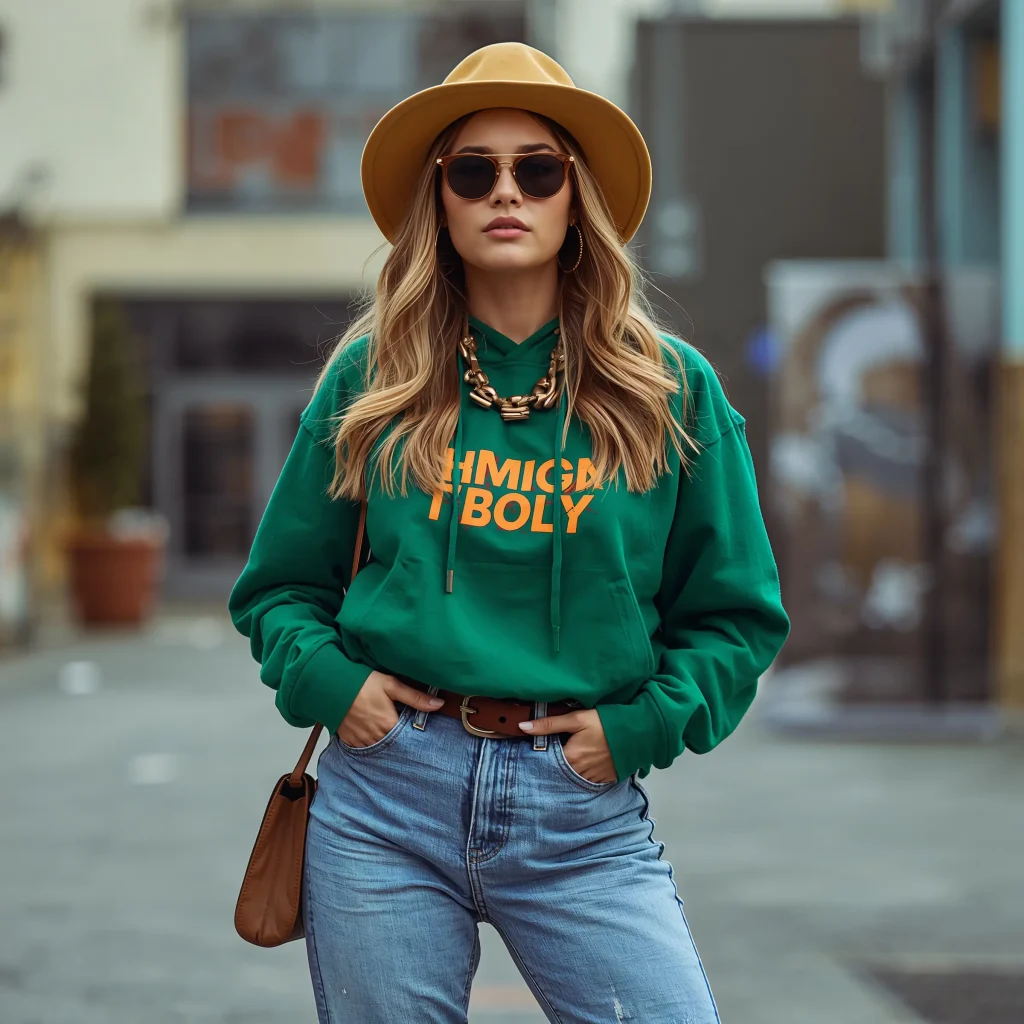 Sometimes your green hoodie just needs a little extra something. Statement accessories can transform your basic hoodie into a look that turns heads. We’re talking bold chains, oversized sunglasses, that designer belt you splurged on – now’s their time to shine.