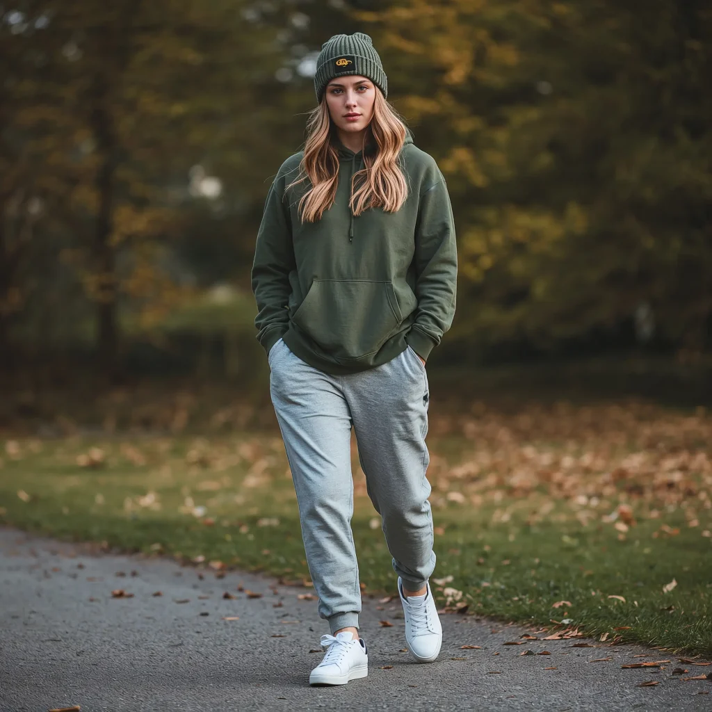 The trick here is making sure everything fits well. Joggers should hit right at the ankle, the hoodie shouldn’t be swimming on you (unless that’s your vibe), and the beanie should sit just right – not too tight, not falling off. I love this look with my sage green hoodie, charcoal joggers, and a cream beanie. Looks effortless but trust me, thought went into it.