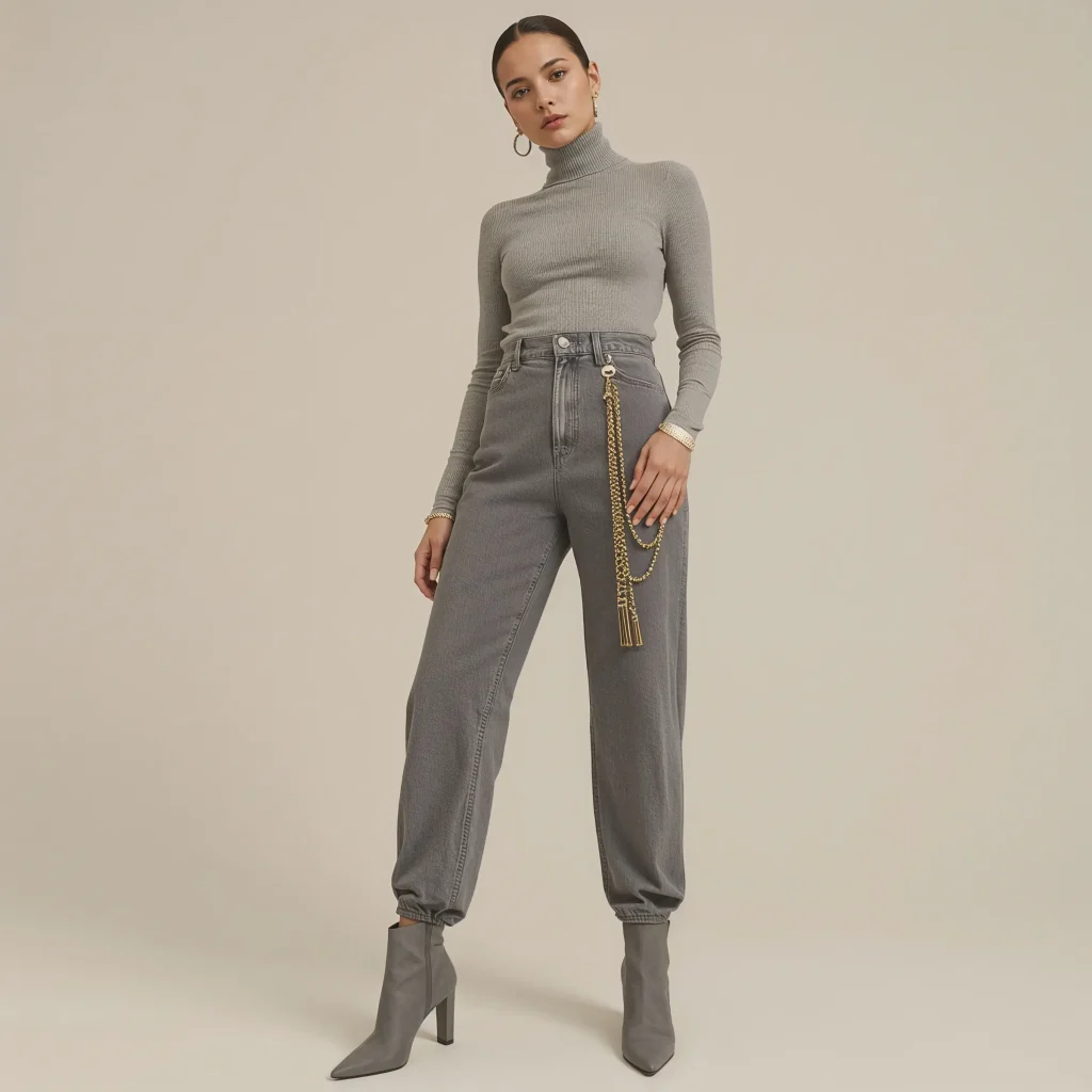 The oversized blazer trend isn’t going anywhere, and thank goodness for that. Pairing one with grey baggy jeans creates this powerful yet relaxed silhouette that works from morning meetings to evening events.