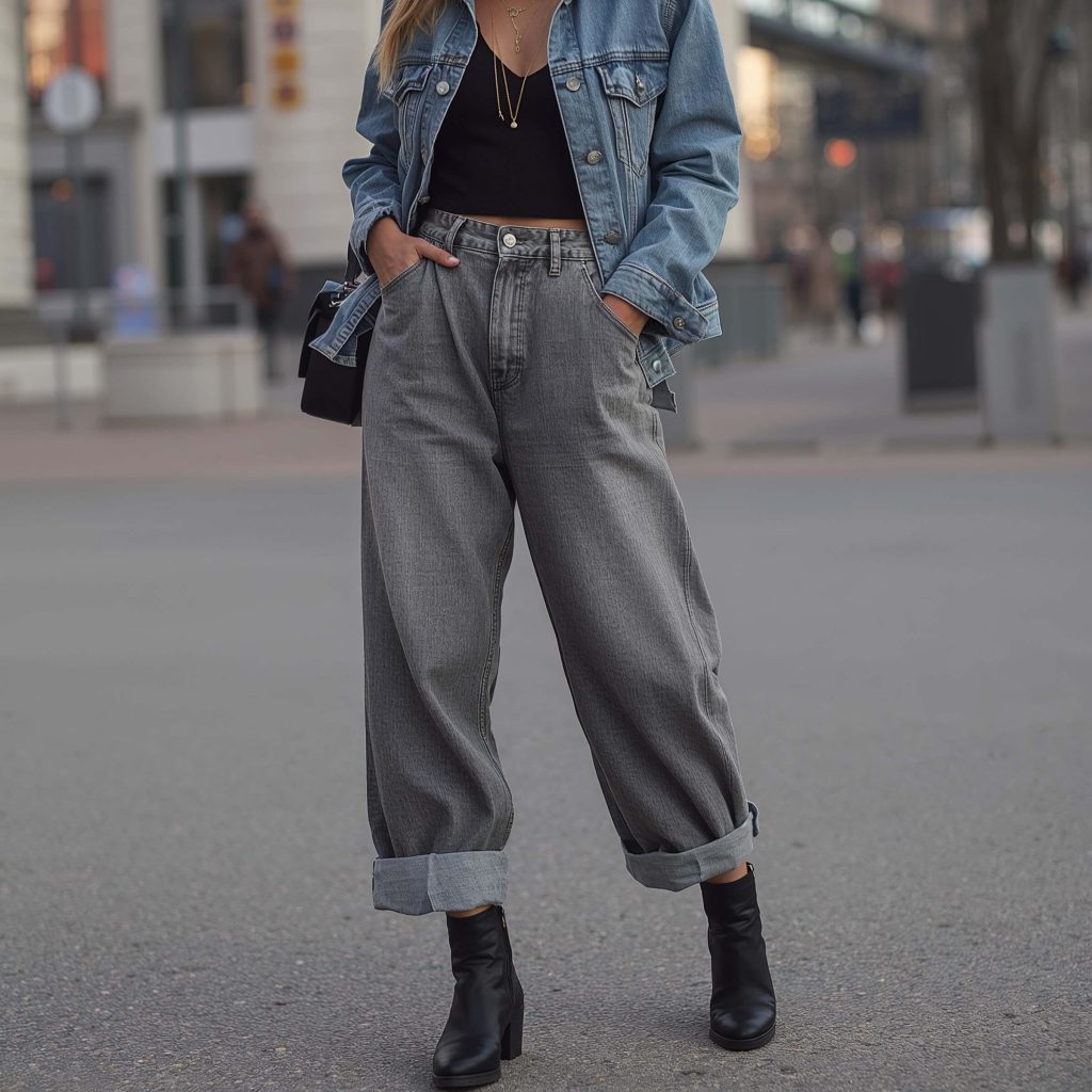 Pair your grey baggy jeans with a silk camisole or fitted bodysuit in black or jewel tones. Add strappy heels (yes, heels with baggy jeans – revolutionary, I know) and a cropped leather jacket. The mix of textures and the unexpected shoe choice creates this effortlessly sexy vibe.