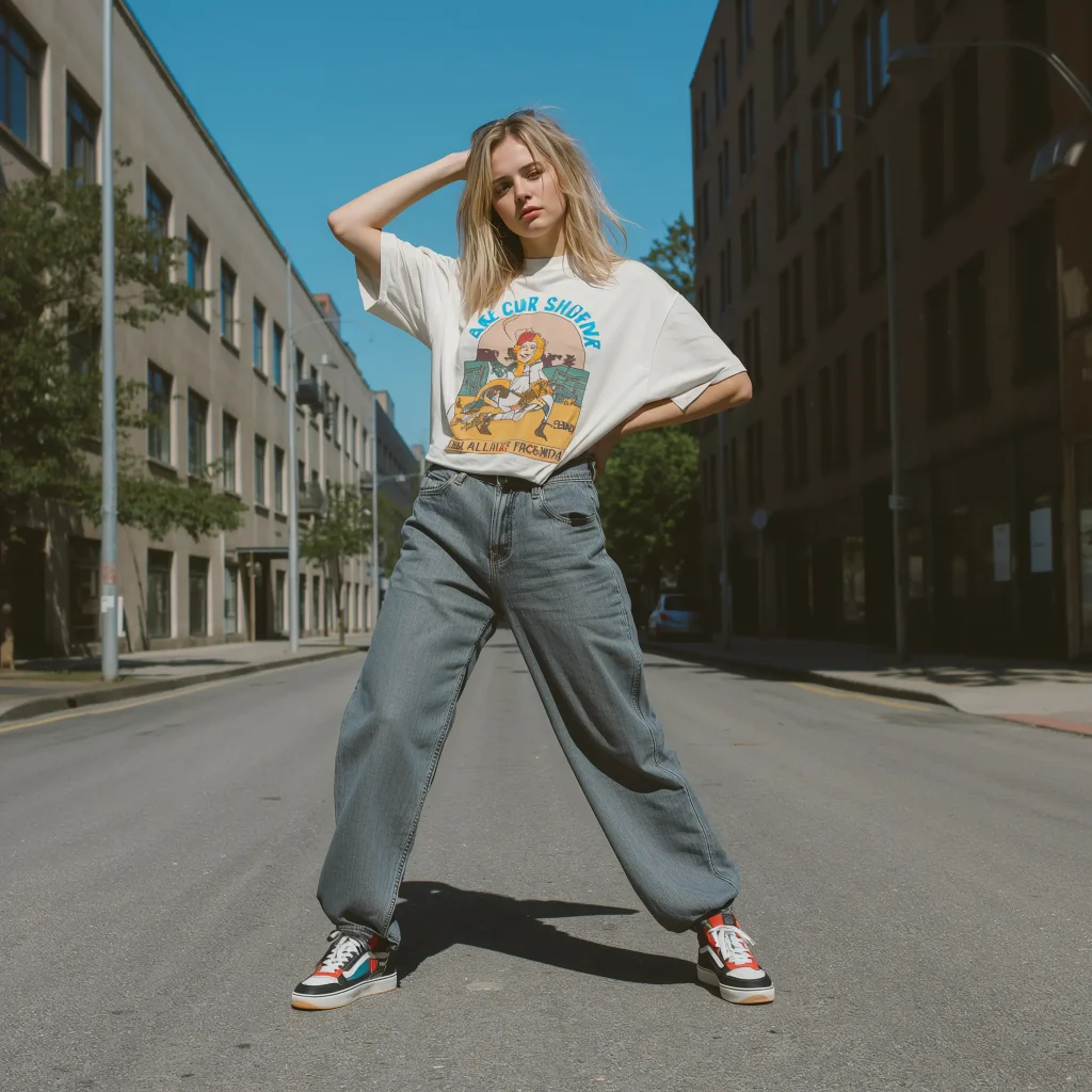The trick? Let the tee be the star. Keep everything else simple – grey baggy jeans, basic sneakers, minimal accessories. I usually go for a slightly oversized vintage tee, but not so big that it competes with the jeans’ volume.