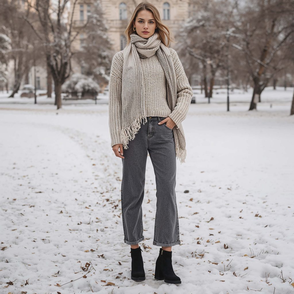 Choose a sweater that’s genuinely oversized – not just a size up, but properly drowning-in-fabric oversized. Cream, beige, or soft pink colors work beautifully with grey jeans. The contrast between the slouchy top and relaxed bottom creates this effortlessly cool silhouette.