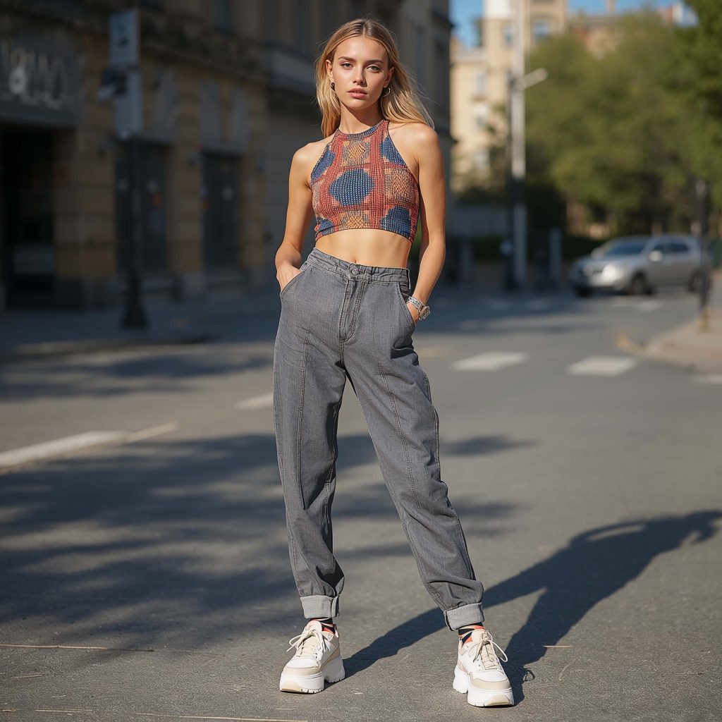 Choose a fitted crop top (ribbed textures work great) and high-waisted grey baggy jeans. The small gap of skin breaks up the outfit and adds interest without being too revealing. Platform sandals or chunky sneakers complete this Y2K-inspired look.