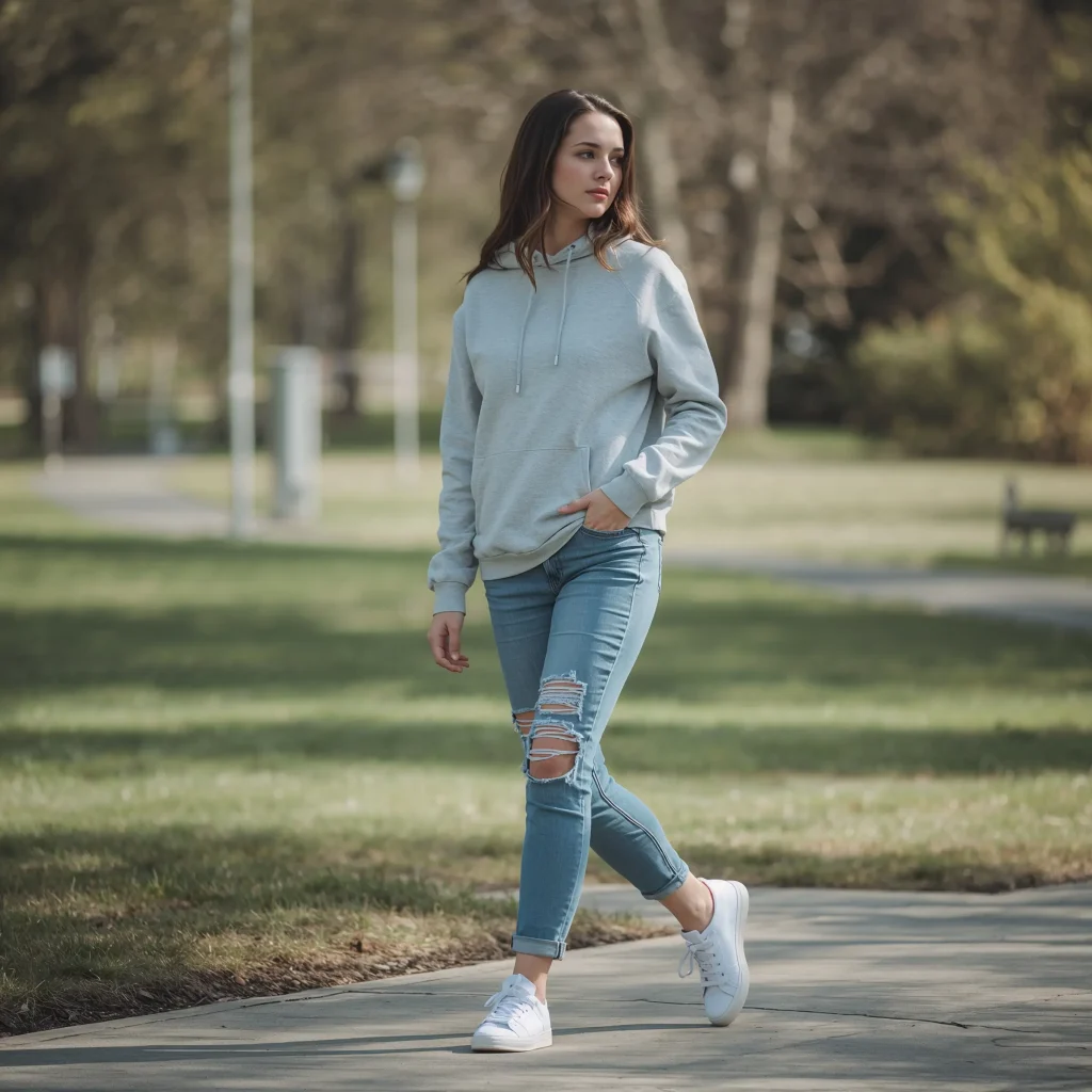 Start with your favorite grey hoodie – mine’s slightly oversized because who doesn’t love that cozy factor? Pair it with dark wash straight-leg jeans that hit right at the ankle. The key here is choosing jeans that aren’t too tight or too baggy. You want that perfect middle ground that says “I made an effort, but not too much effort.”