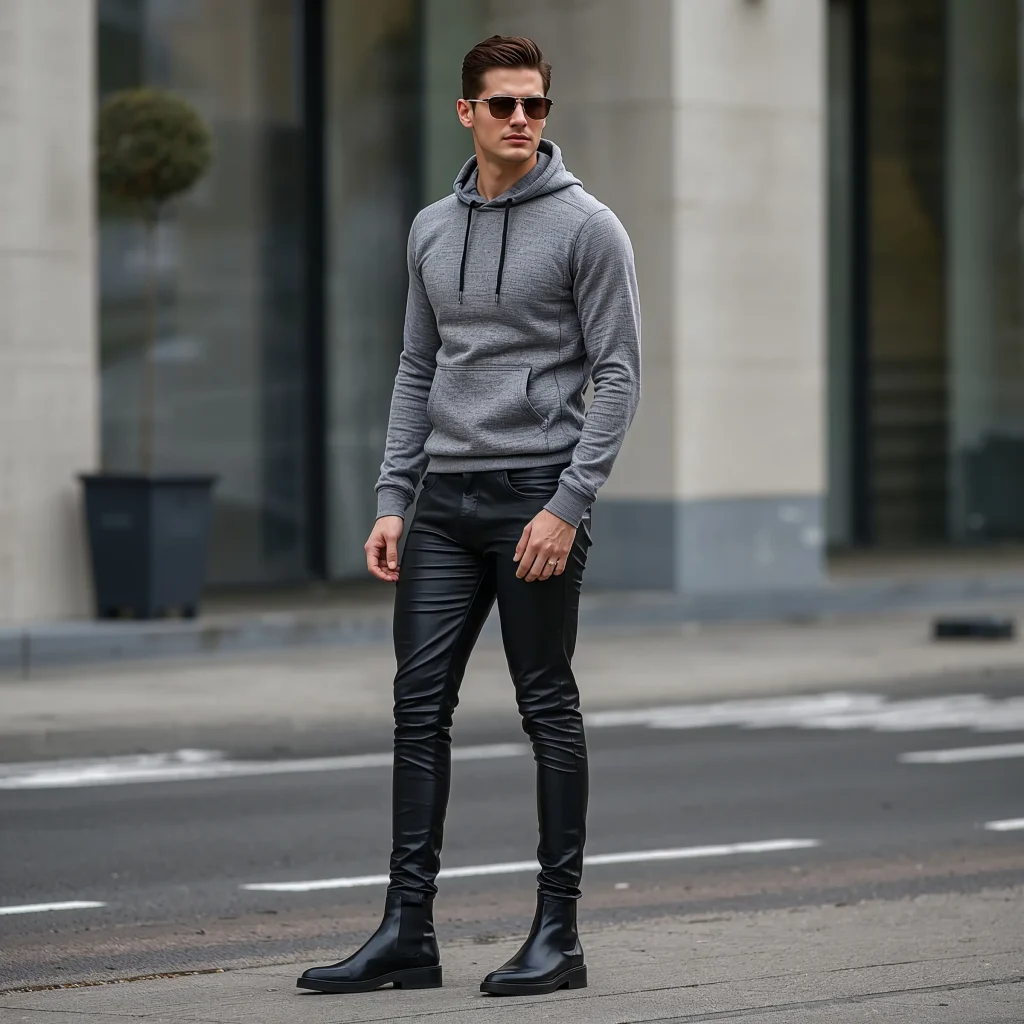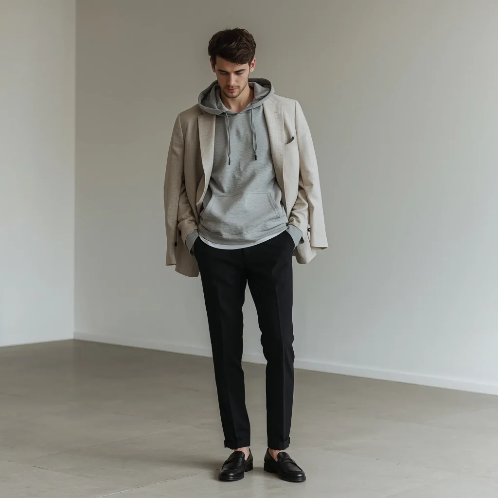 Grab your grey hoodie and layer it under a structured blazer – yes, you heard that right. The contrast between casual and formal creates instant intrigue. Choose a blazer in black, navy, or even a bold pattern if you’re feeling adventurous. The hoodie’s hood should peek out from the blazer’s collar, creating that perfect high-low mix.