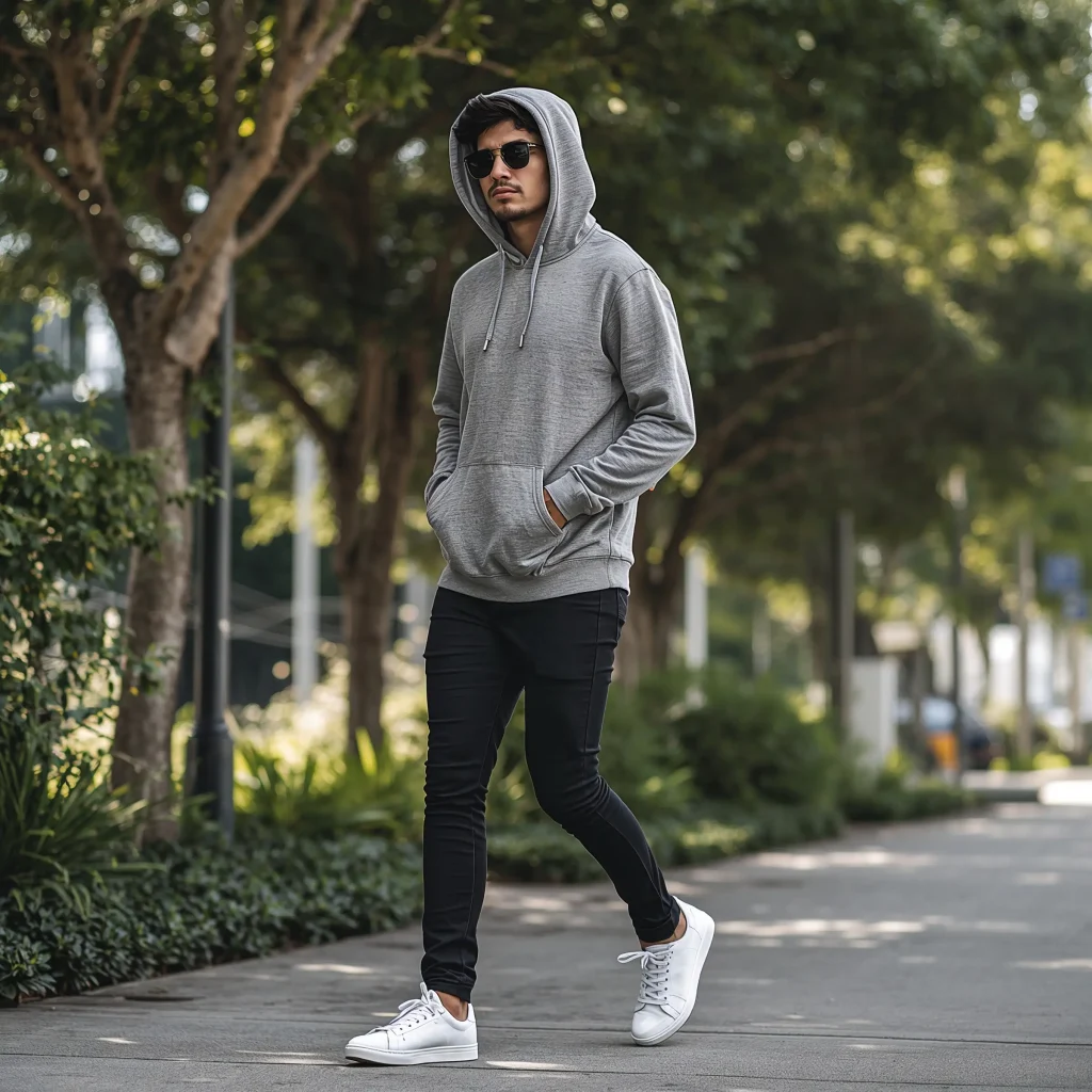 Start with your grey hoodie as the centerpiece. Add charcoal grey pants – could be jeans, chinos, or even sweatpants if they’re the fitted kind. Layer with a light grey or white tee underneath, letting it peek out at the bottom. The magic happens when you mix textures: cotton hoodie, denim pants, leather shoes.