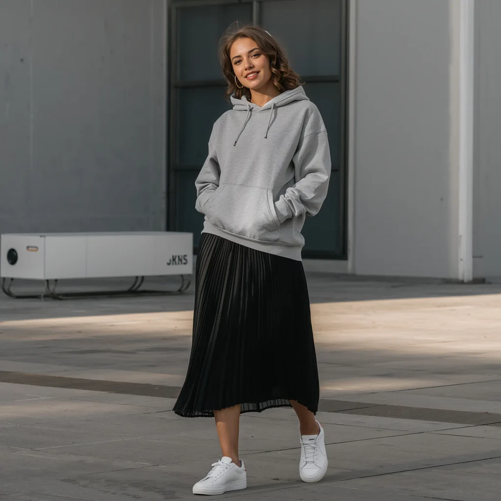 Who says hoodies can’t be feminine? Pairing a grey hoodie with a skirt creates that perfect sweet-meets-street vibe that I absolutely adore. This combination has become my go-to for casual dates and weekend shopping trips.