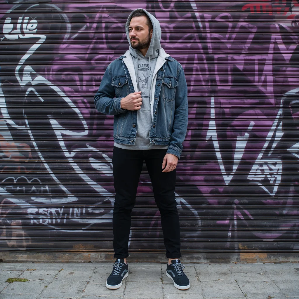 Choose jeans that fit you perfectly – and I mean perfectly. Whether you prefer skinny, straight, or relaxed fit, the key is ensuring they’re not too long or too short. Cuff them once if needed. Your grey hoodie should complement the jeans’ wash, so if you’re wearing light jeans, go for a darker grey hoodie and vice versa.