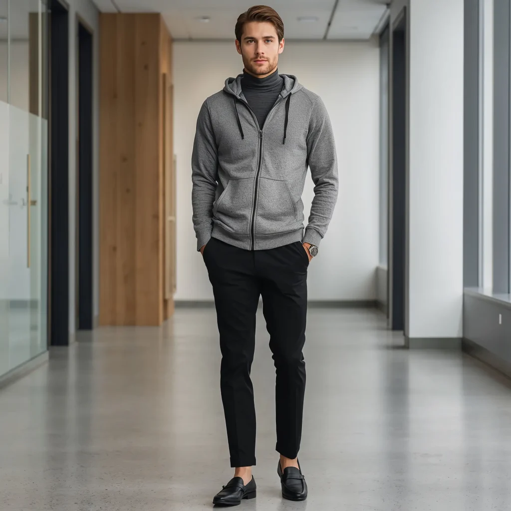 Remember: confidence sells any outfit better than the clothes themselves. Wear that grey zip-up like you meant to, not like it was the only clean thing left. Stand up straight, own your choices, and watch how differently people respond.