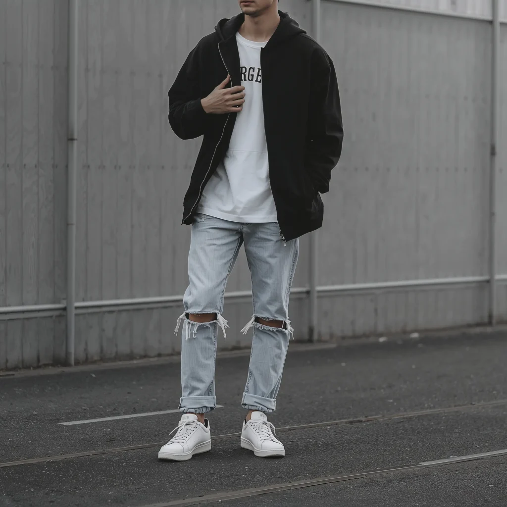 This is where most of us start, and honestly? It’s still one of my go-to looks. The classic streetwear combination involves pairing your hoodie with straight-leg jeans and fresh sneakers. Simple, right? But here’s where most guys mess up – they think any hoodie with any jeans works.