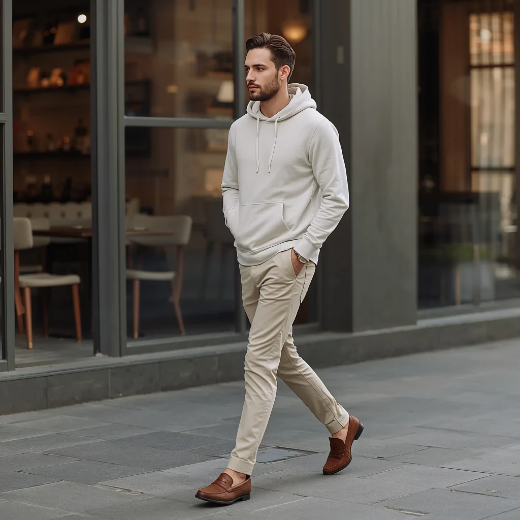 I discovered this combo works best with slim-fit or tailored chinos. The structured bottom balances out the casual top perfectly. Navy chinos with a gray hoodie? That’s my Monday morning uniform right there. Khaki chinos with a navy or burgundy hoodie creates this preppy-meets-street vibe that just works.