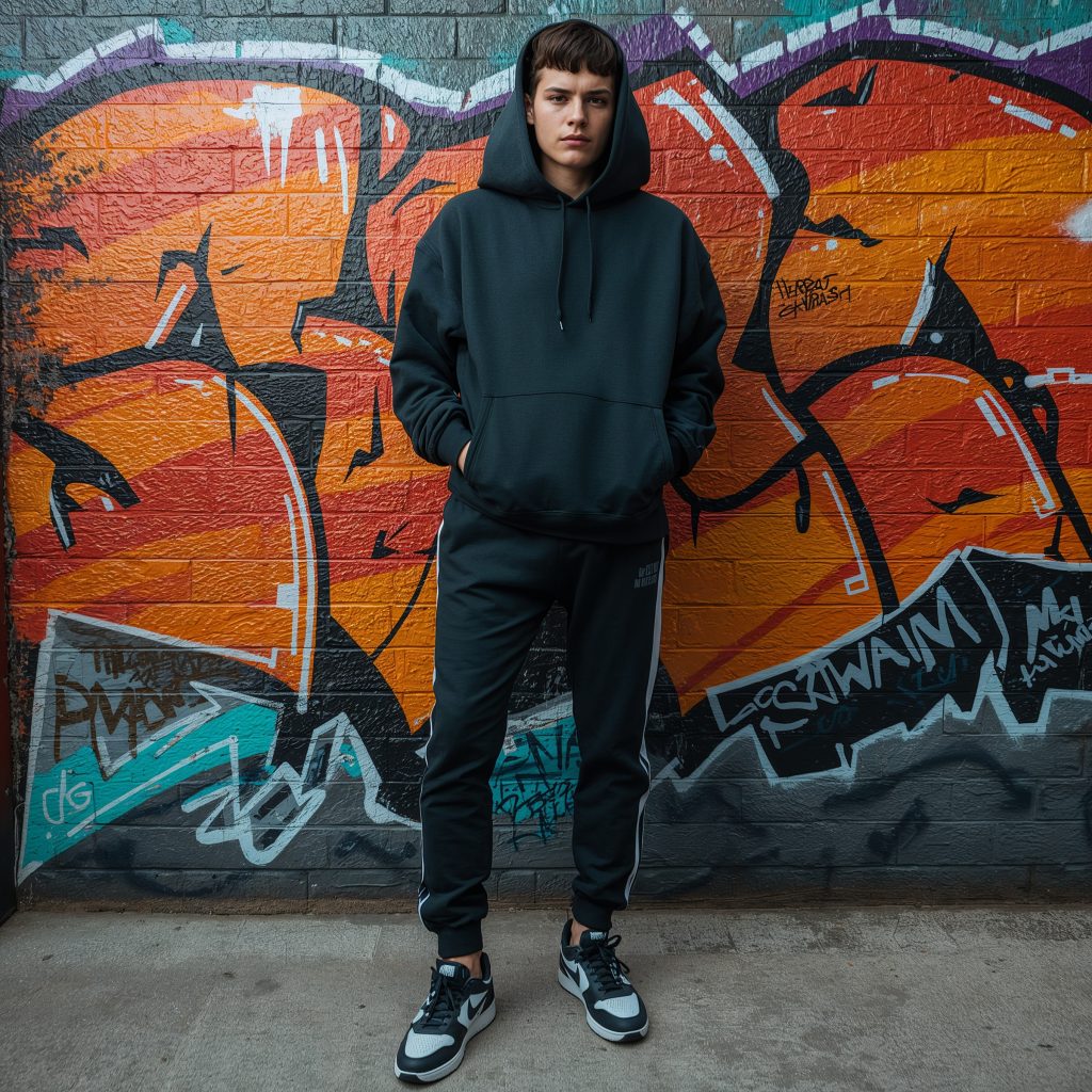 Want to elevate this basic formula? Add accessories like a baseball cap or a simple chain necklace. The key is keeping everything balanced – if your hoodie is oversized, stick with slimmer jeans. If you’re wearing baggy jeans, opt for a more fitted hoodie.