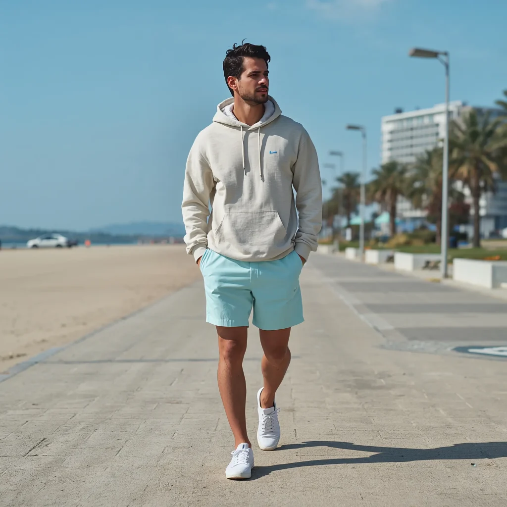 I keep several thin, breathable hoodies specifically for summer. Think cotton-linen blends or lightweight French terry. Pair these with shorts and low-top sneakers for a look that says “I understand weather-appropriate dressing.”