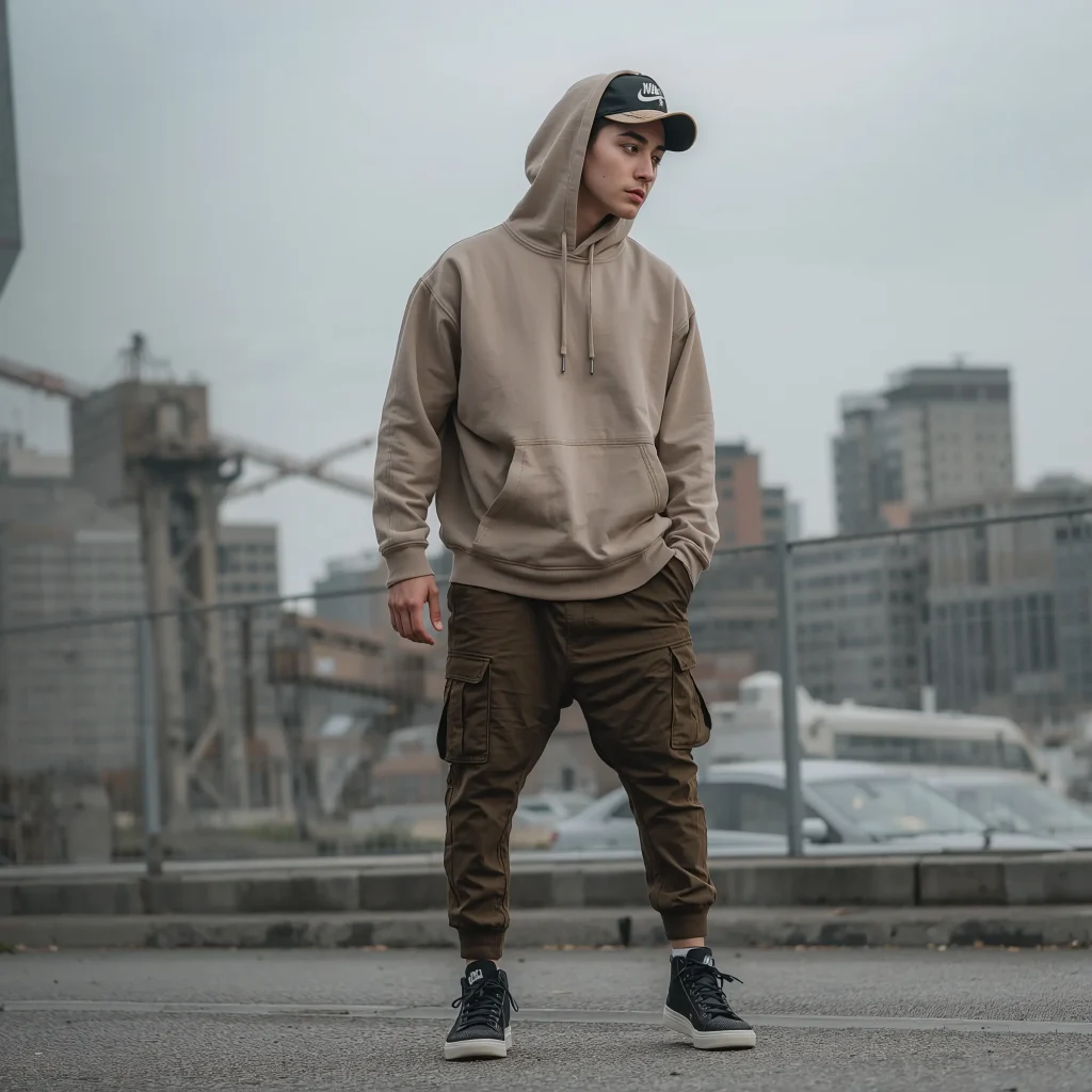 - Tan hoodie + brown cargos (earthy and grounded)