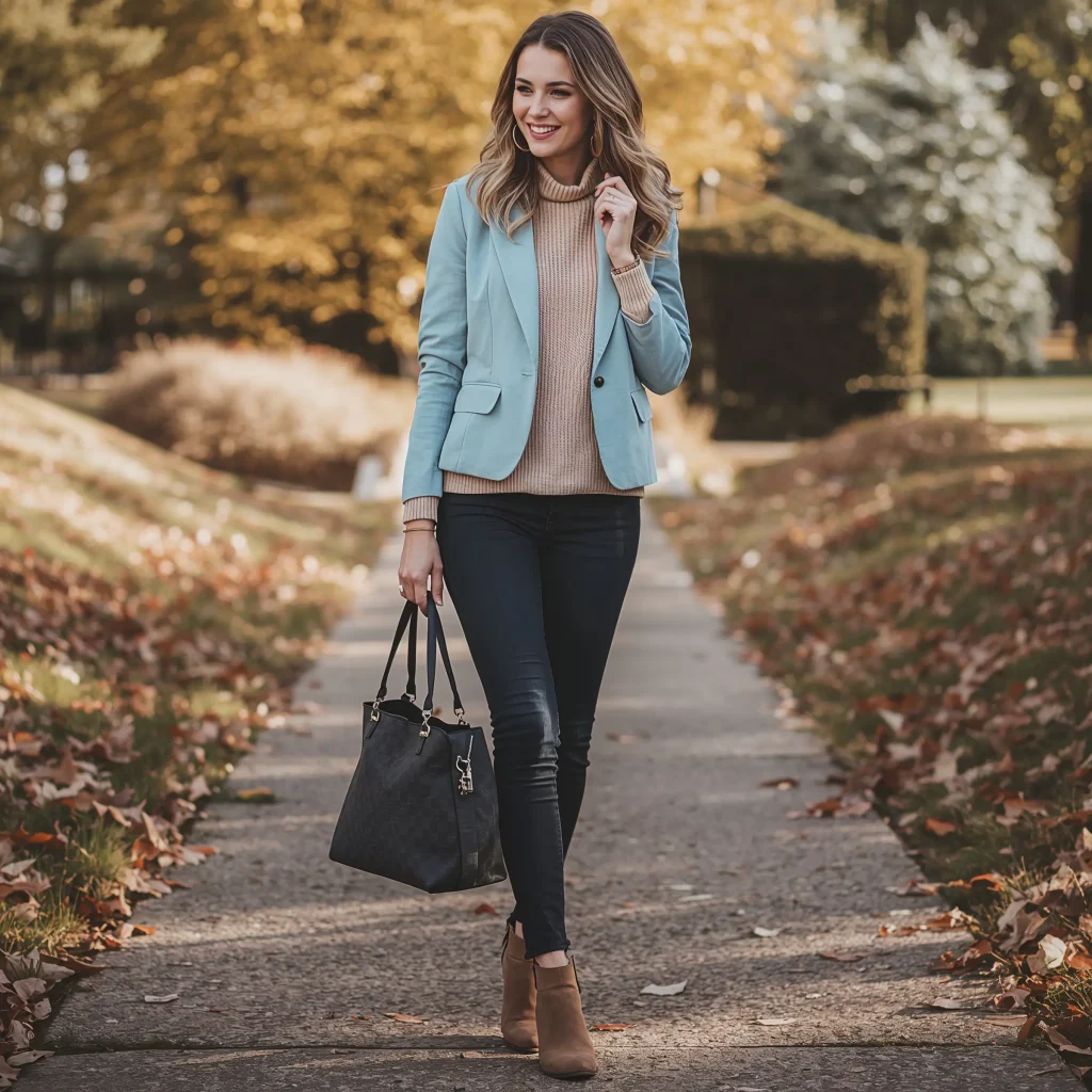 For evening, don’t be afraid to go bold with accessories. Statement earrings, layered necklaces, or a dramatic cocktail ring all work beautifully against the light blue backdrop. The blazer’s soft color won’t compete with your bling.