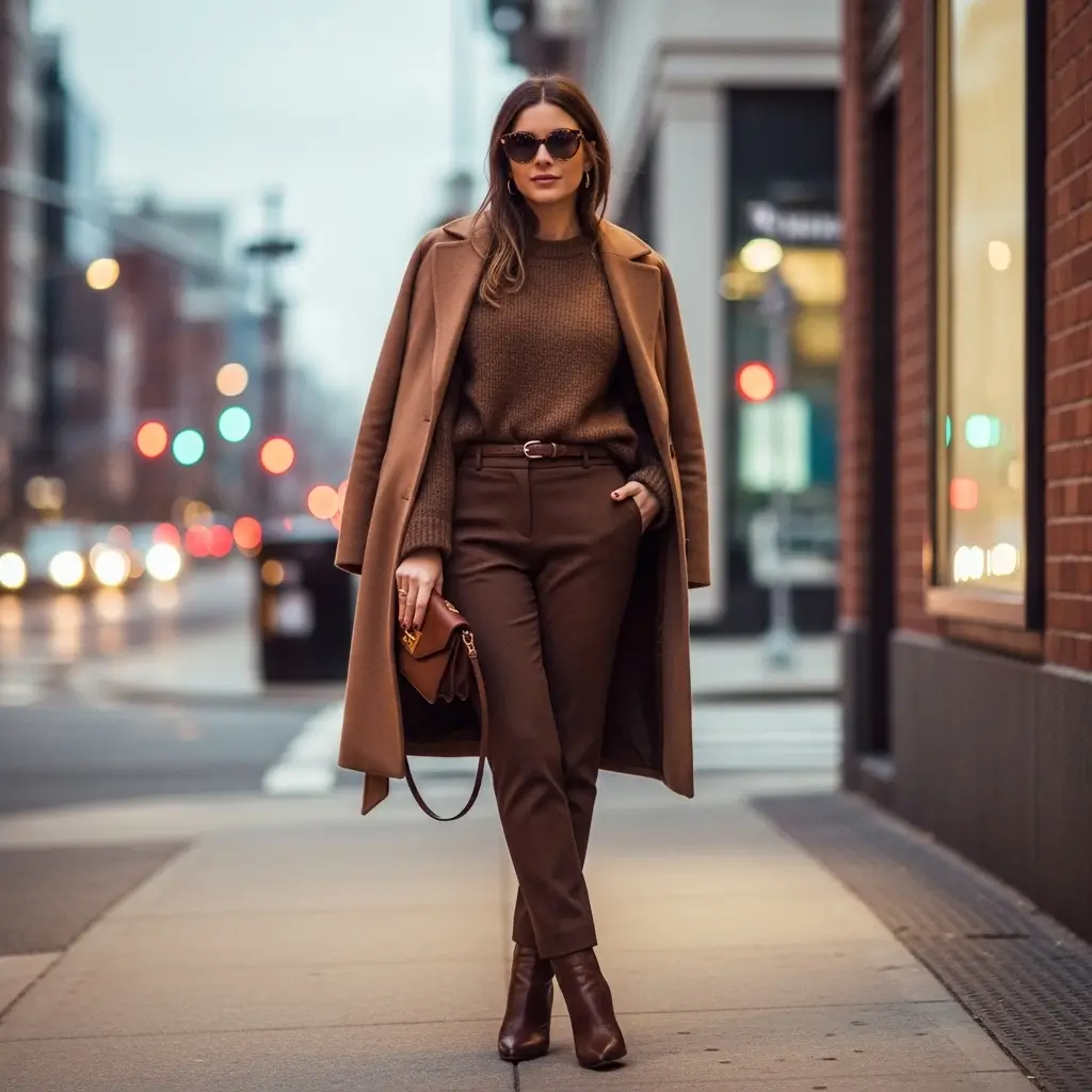 Start with your brown pants as the base. Then layer different brown tones on top – maybe a caramel sweater, a tan coat, and cognac accessories. The key is varying the shades enough to create visual interest without looking like you got dressed in the dark.