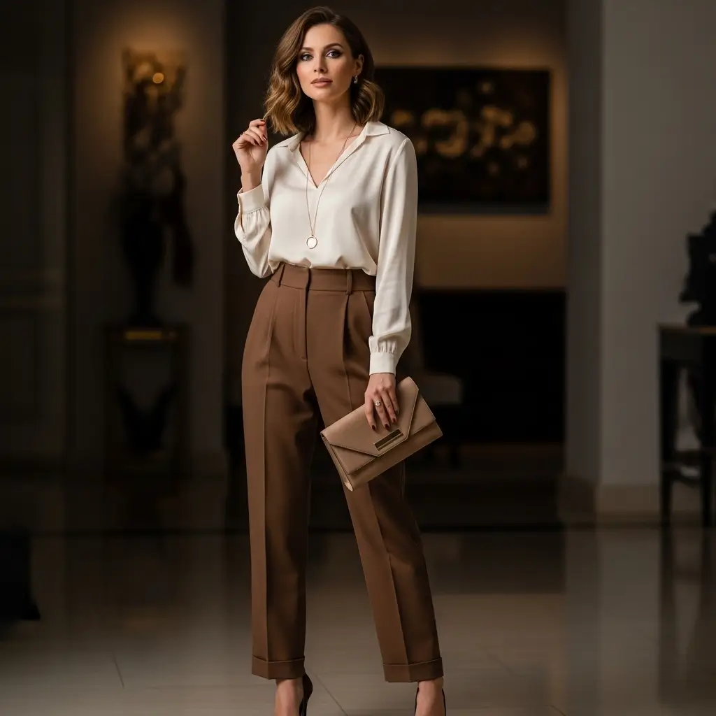 Elegant Evening with Silk Blouse and Brown Pants