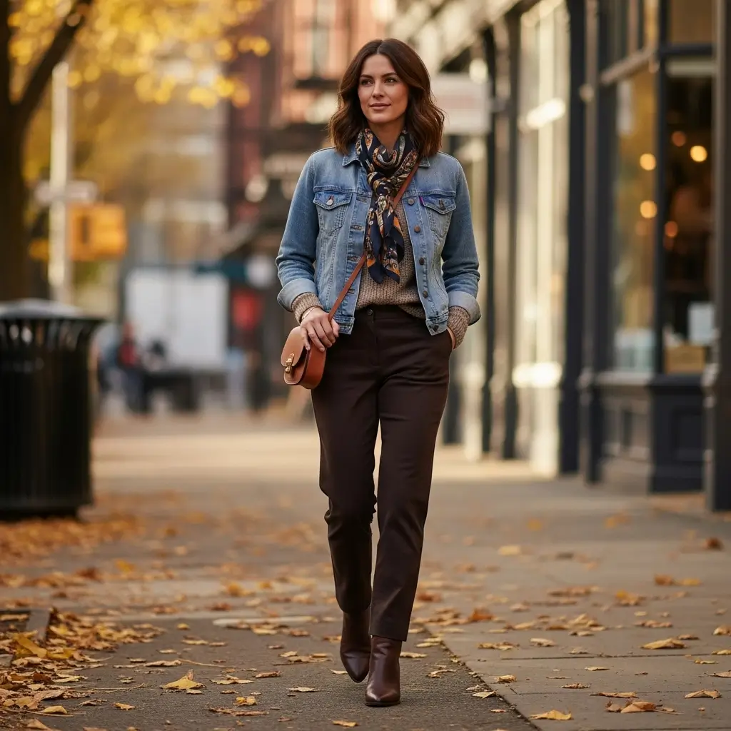 Start with your brown pants and a basic top. Then add a jacket – denim, leather, bomber, whatever speaks to you. Now here’s where the magic happens: add a scarf that pulls everything together.
