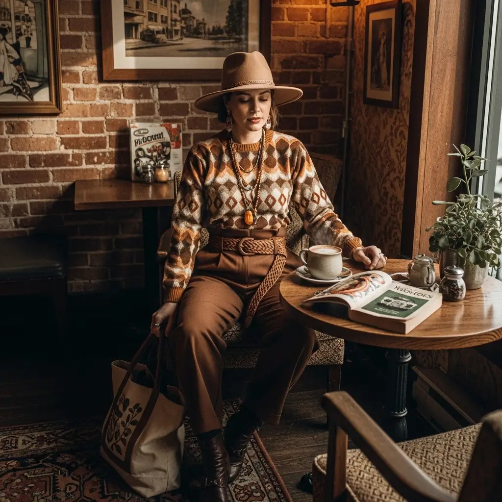 Cream and ivory sweaters create this dreamy, soft palette that’s basically a hug in outfit form. But don’t sleep on jewel tones! Deep emerald or burgundy sweaters with brown pants? Chef’s kiss. The warmth of brown grounds these rich colors perfectly.