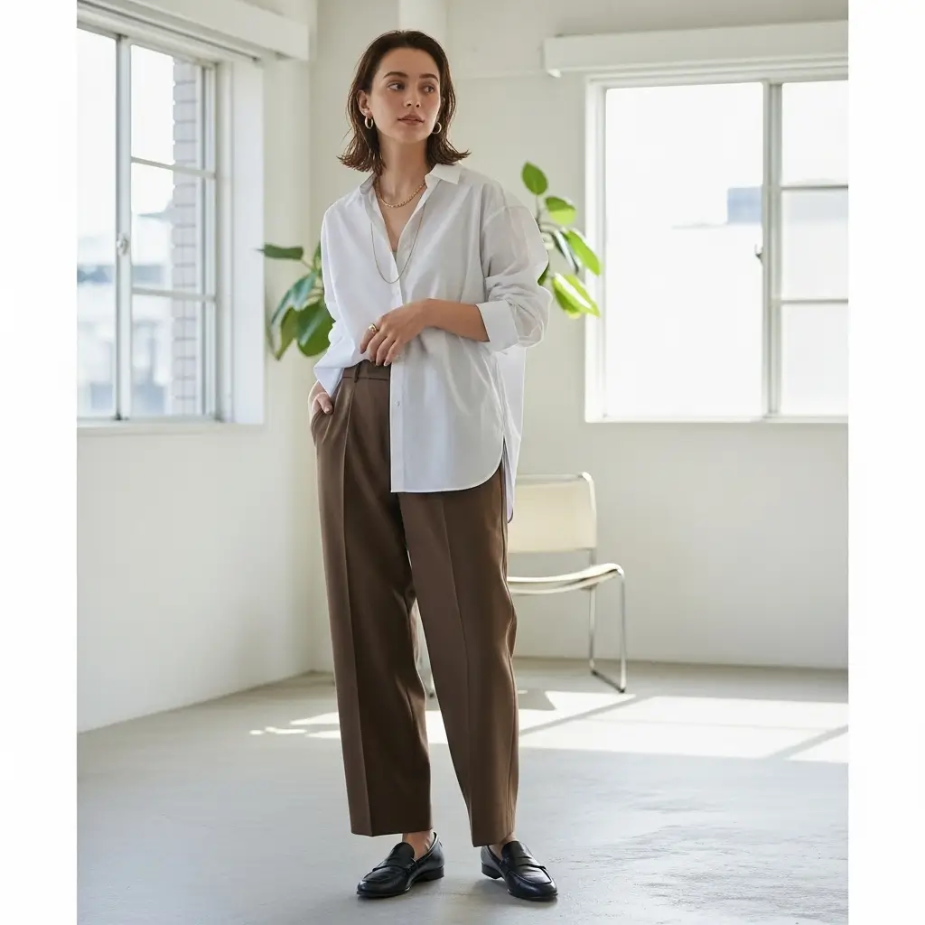 This outfit makes you look like you have your life together, even if you definitely don’t. The crispness of white against warm brown creates visual interest through contrast alone.