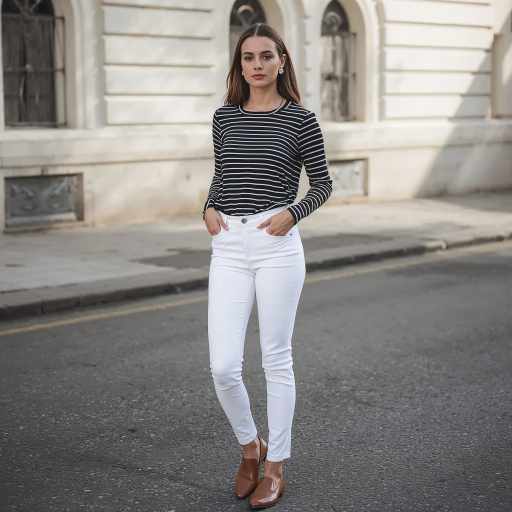 I remember the first time I wore this combo – grabbed my favorite navy and white striped shirt, threw on my white jeans, and suddenly felt like I should be riding a bicycle through Paris with a baguette in the basket. The beauty of this look? It works with any stripe pattern you choose.