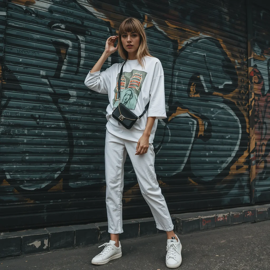 My go-to weekend uniform involves white jeans, a vintage band tee, and my trusty white sneakers. It’s comfortable enough for running errands but cool enough for impromptu brunch plans.