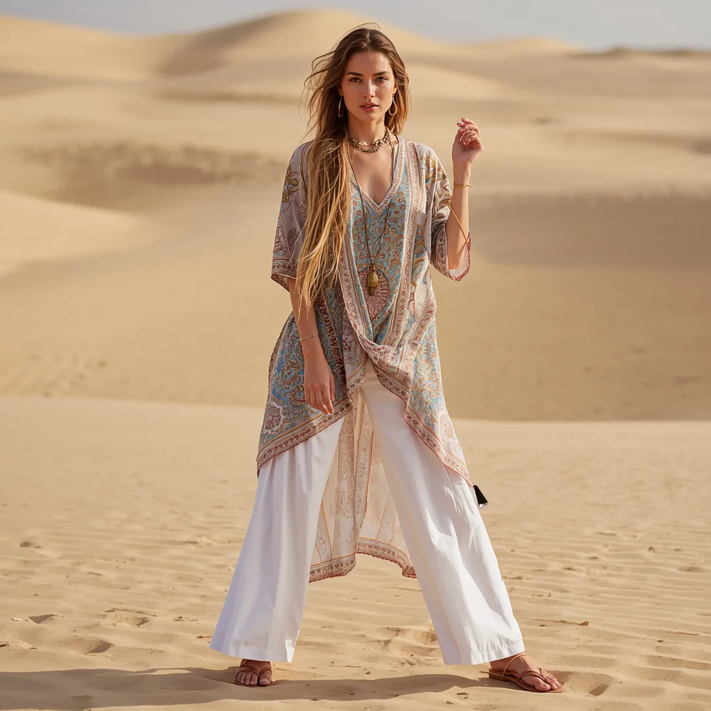 Channel your inner free spirit with white pants and a flowing tunic. This combination creates movement and drama without trying too hard – perfect for music festivals, beach vacations, or just feeling ethereal at the grocery store.