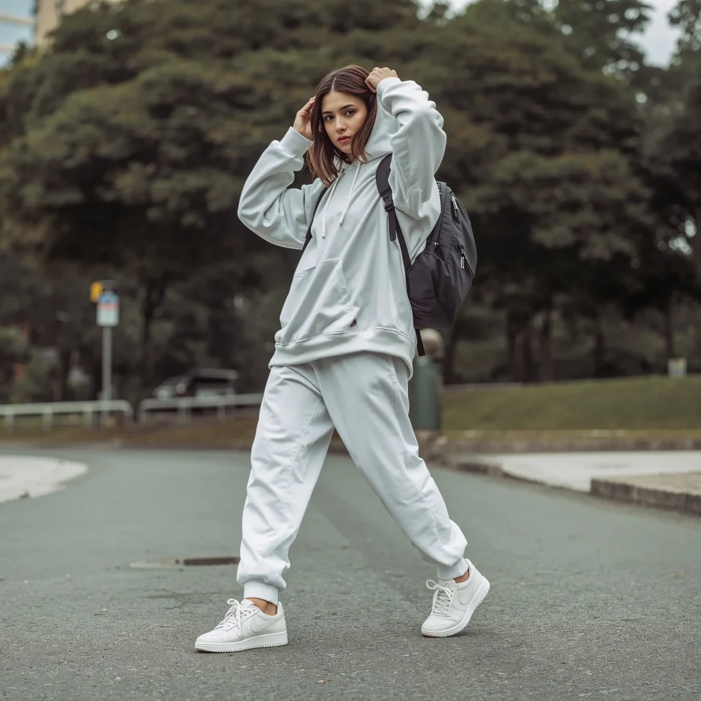 Sometimes you want to look put-together while feeling like you’re wearing pajamas. White pants with a hoodie and trainers delivers exactly that – athleisure at its finest.