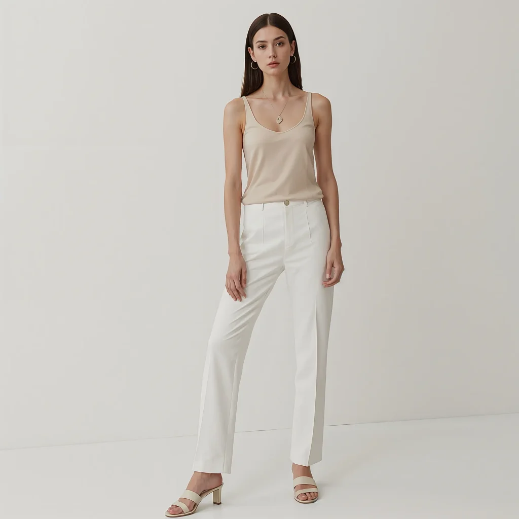 For those who worship at the altar of minimalism, white pants with neutral tops create the perfect capsule wardrobe foundation. Think beige, cream, tan, grey – all those colors that sound boring but look expensive.
