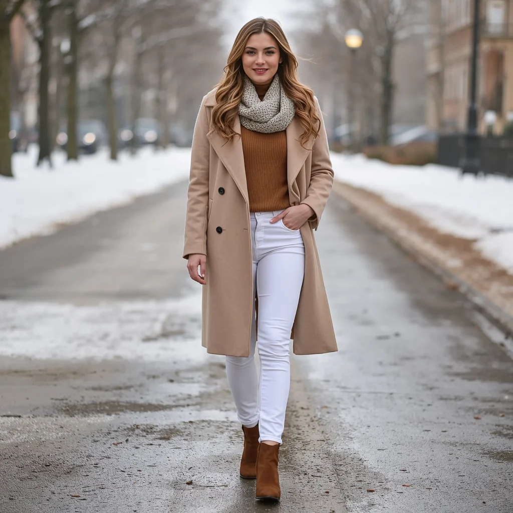 Who says white pants hibernate in winter? Layer them under a statement coat with a cozy scarf for unexpected cold-weather style.