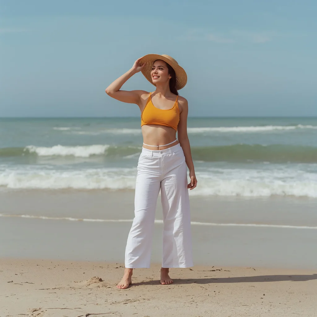 Discovered this combo during a Miami trip where regular clothes felt too restrictive. The crop top keeps you cool while the white pants protect your legs from scorching beach bar stools.