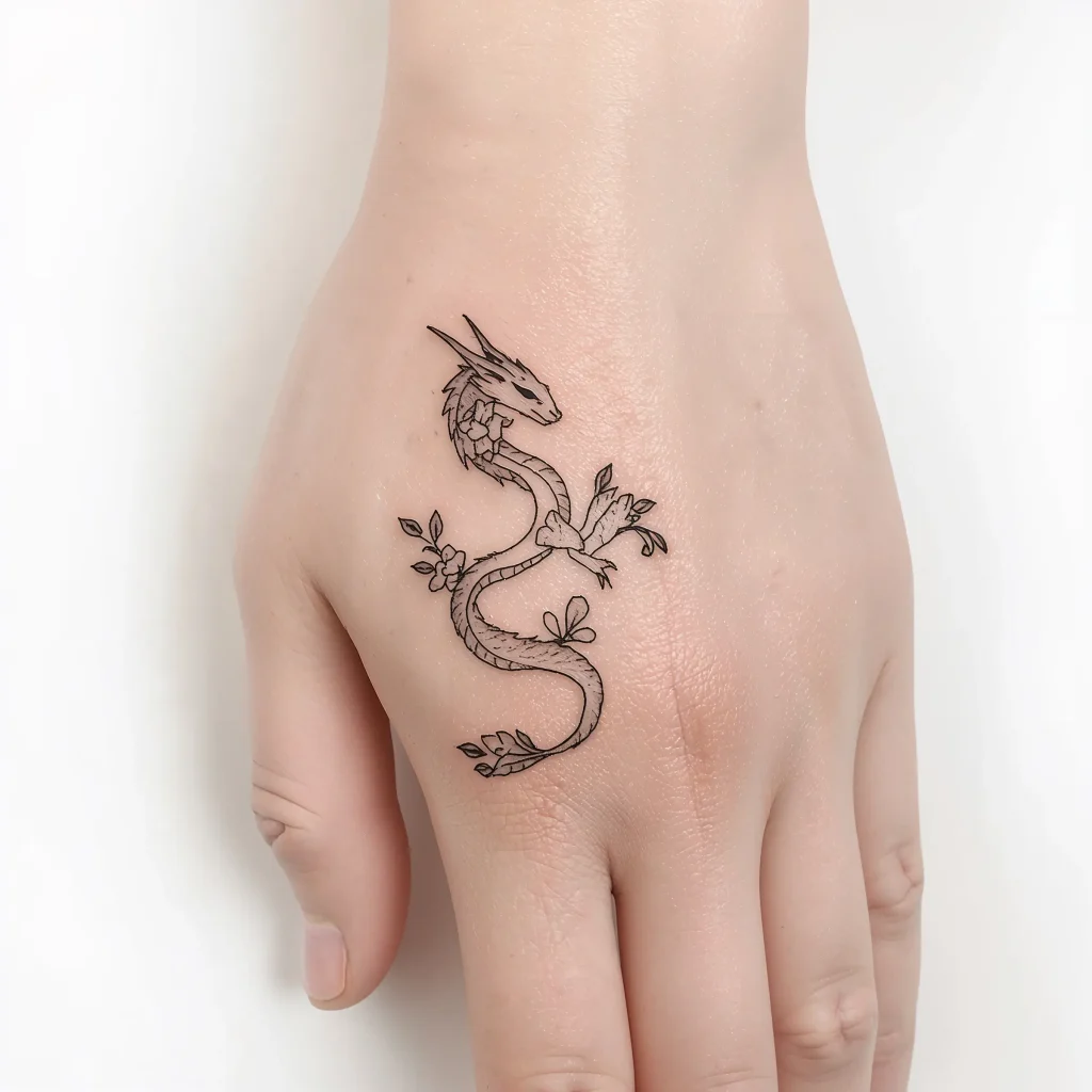The contrast here creates such visual interest. The dragon’s head stays detailed and powerful, while the tail softens into delicate petals. It’s like wearing your duality on your skin – strong yet soft, fierce yet beautiful.