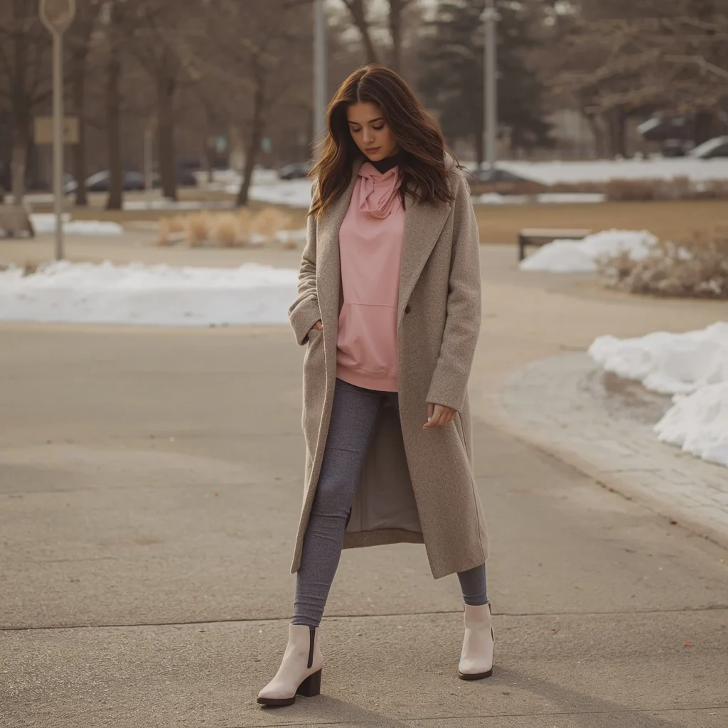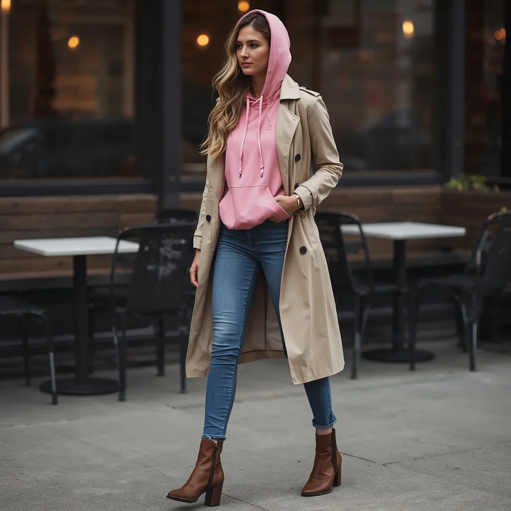 Advanced layering takes your pink hoodie game to the next level. Layer your hoodie over a white button-up shirt with the collar and cuffs showing, then add a trench coat for a look that screams “fashion insider.”