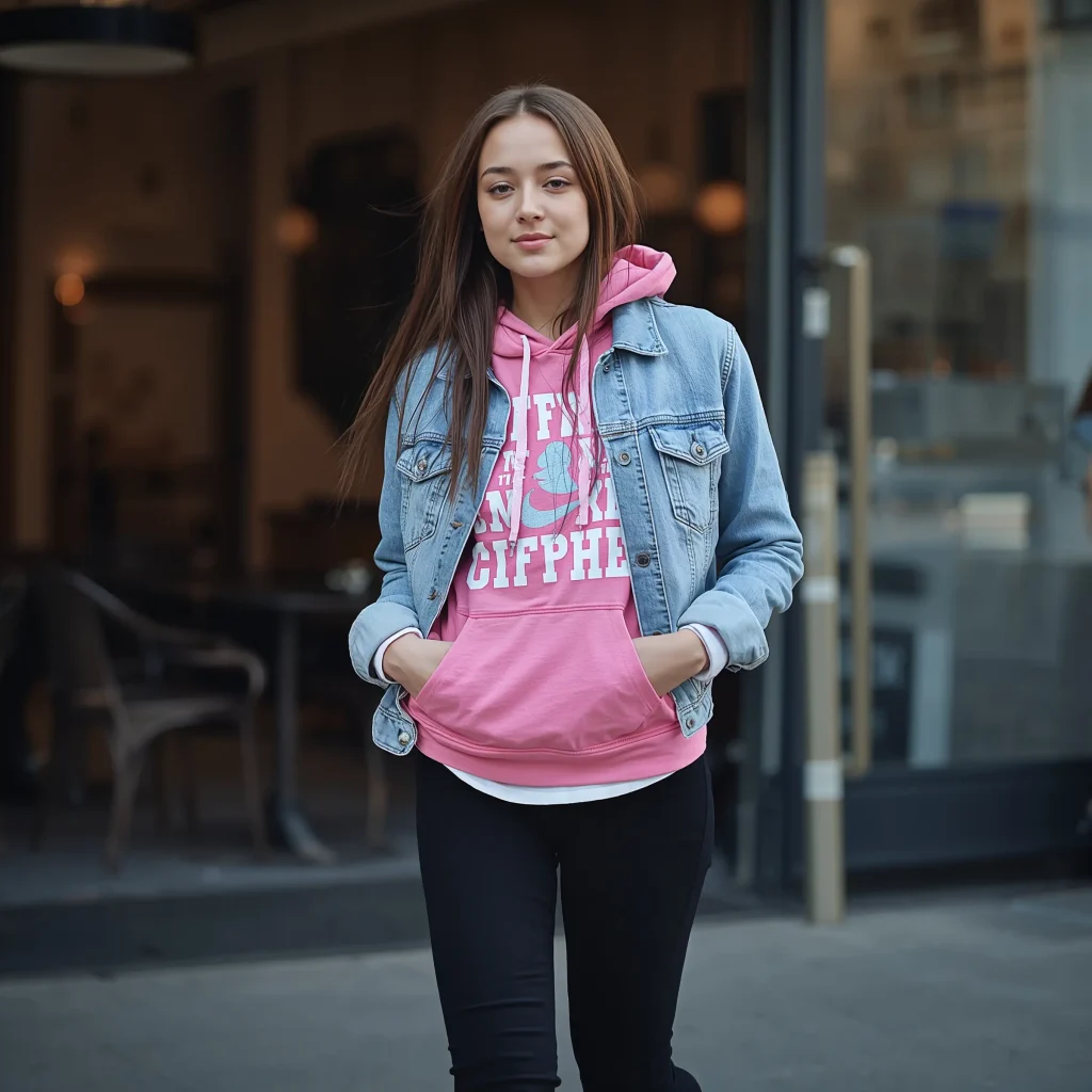 Layering transforms basic outfits into style statements, and throwing a denim jacket over your pink hoodie creates instant visual interest. This combination works year-round and suits literally every body type.