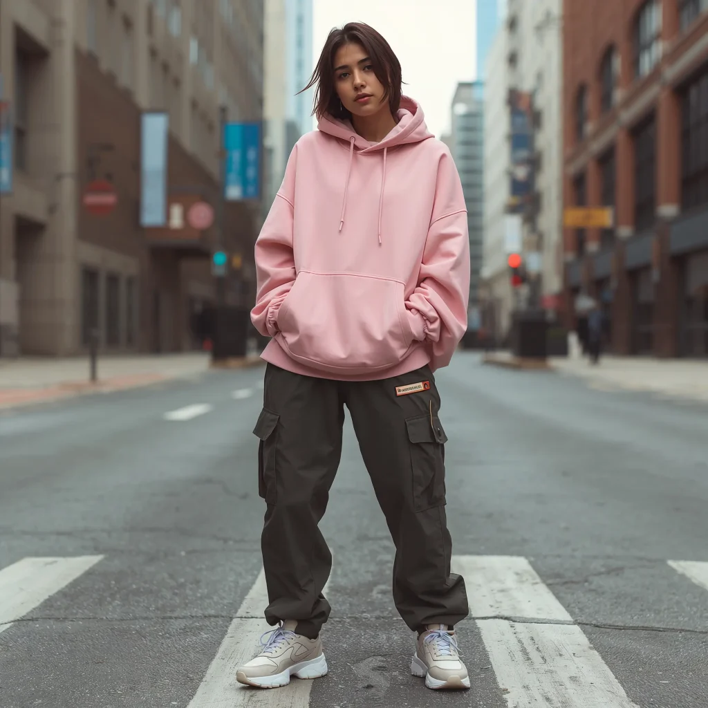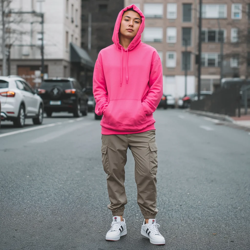Street style requires attitude, and nothing says “I know what I’m doing” quite like pairing your pink hoodie with wide-leg cargo pants and chunky sneakers. This combination screams confidence while keeping you supremely comfortable.