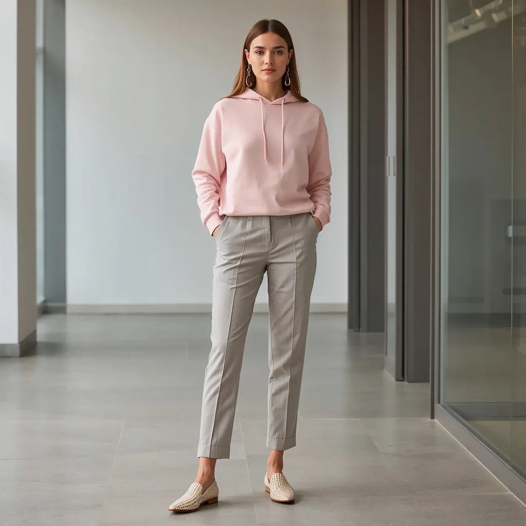 Yes, you can wear hoodies to work (in the right context). Combine your pink hoodie with tailored trousers and loafers for a smart casual look that works in creative offices and casual Fridays.