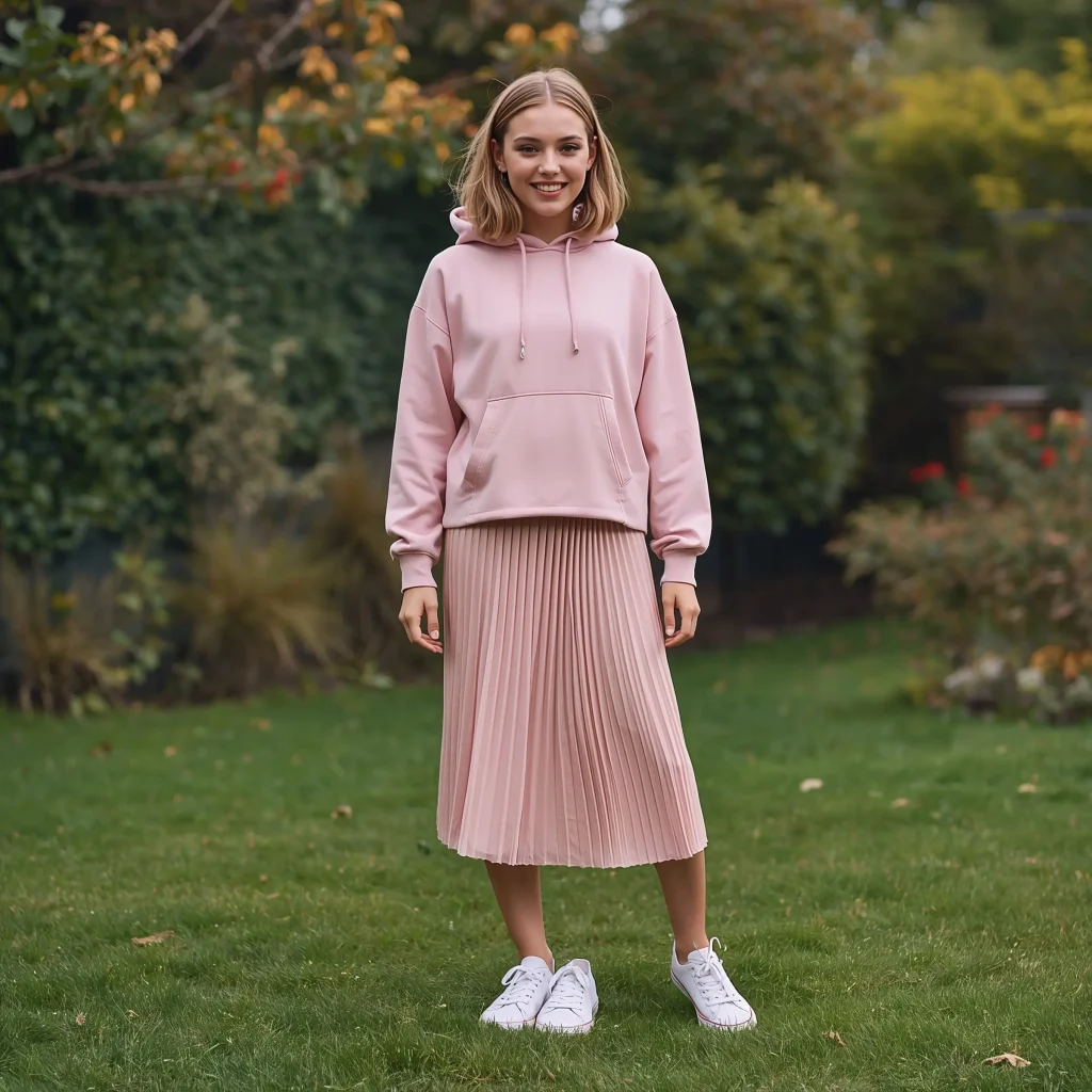Pleated skirts and hoodies create this amazing preppy-meets-sporty aesthetic that feels both nostalgic and modern. Style your pink hoodie with a midi pleated skirt and white sneakers for an outfit that works from coffee dates to casual dinners.
