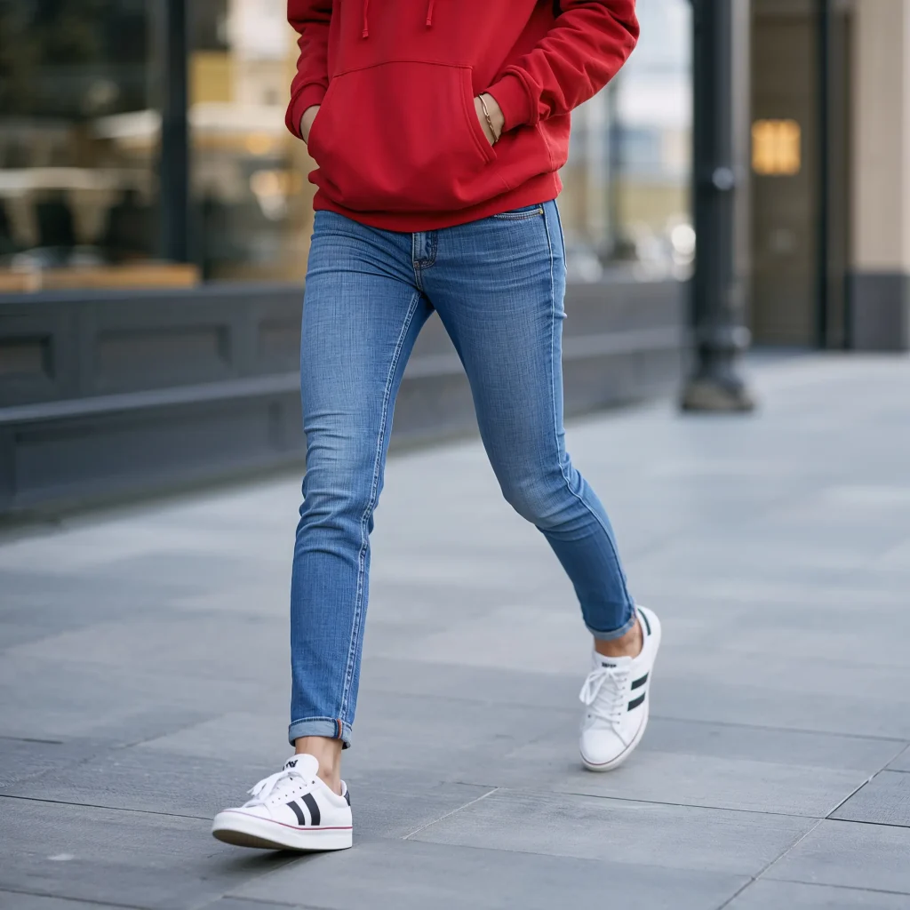 Light wash jeans work brilliantly here because they create a nice contrast without competing with the hoodie. Cuff those jeans slightly to show off your ankle game and add some white leather sneakers. The result? Effortlessly cool with a side of “I definitely didn’t spend 30 minutes picking this outfit.”