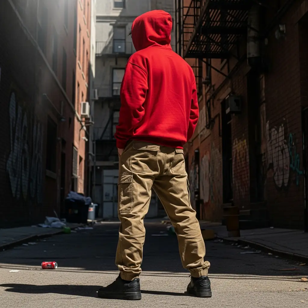 Cargo pants are back, and honestly, I’m not mad about it. The utilitarian vibe of cargos paired with a bright red hoodie creates an outfit that’s both functional and fashionable. Choose cargos in olive green, khaki, or black for best results.