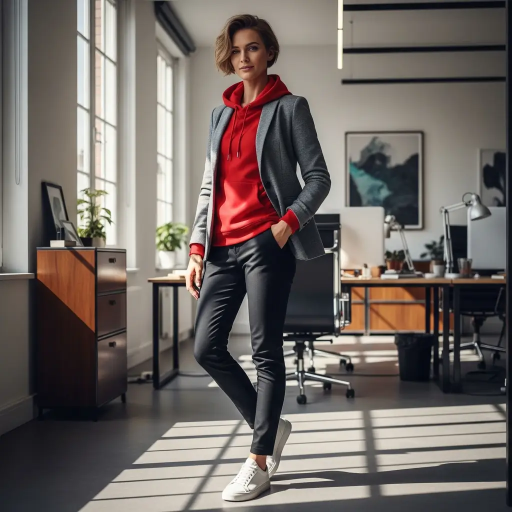 Before you laugh, hear me out. A red hoodie can actually work in certain office environments – you just need to style it right. The key is choosing a fitted, high-quality hoodie in a deeper red shade rather than bright fire-engine red.