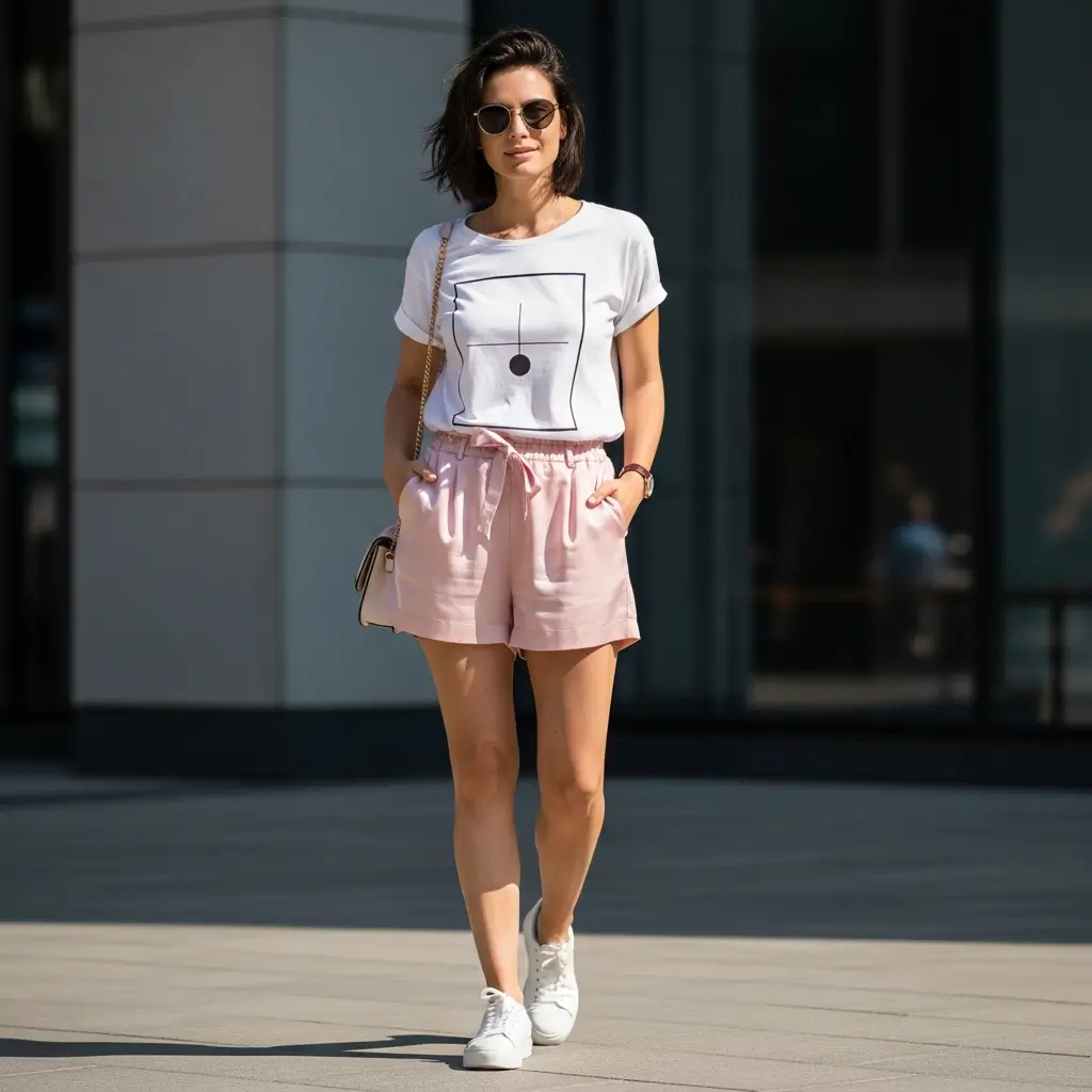 - Soft pink shorts + neutrals or metallics = sunset-ready perfection