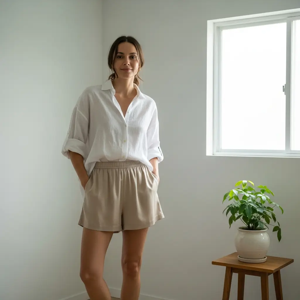- Terracotta shorts + cream linen = warm, earthy perfection