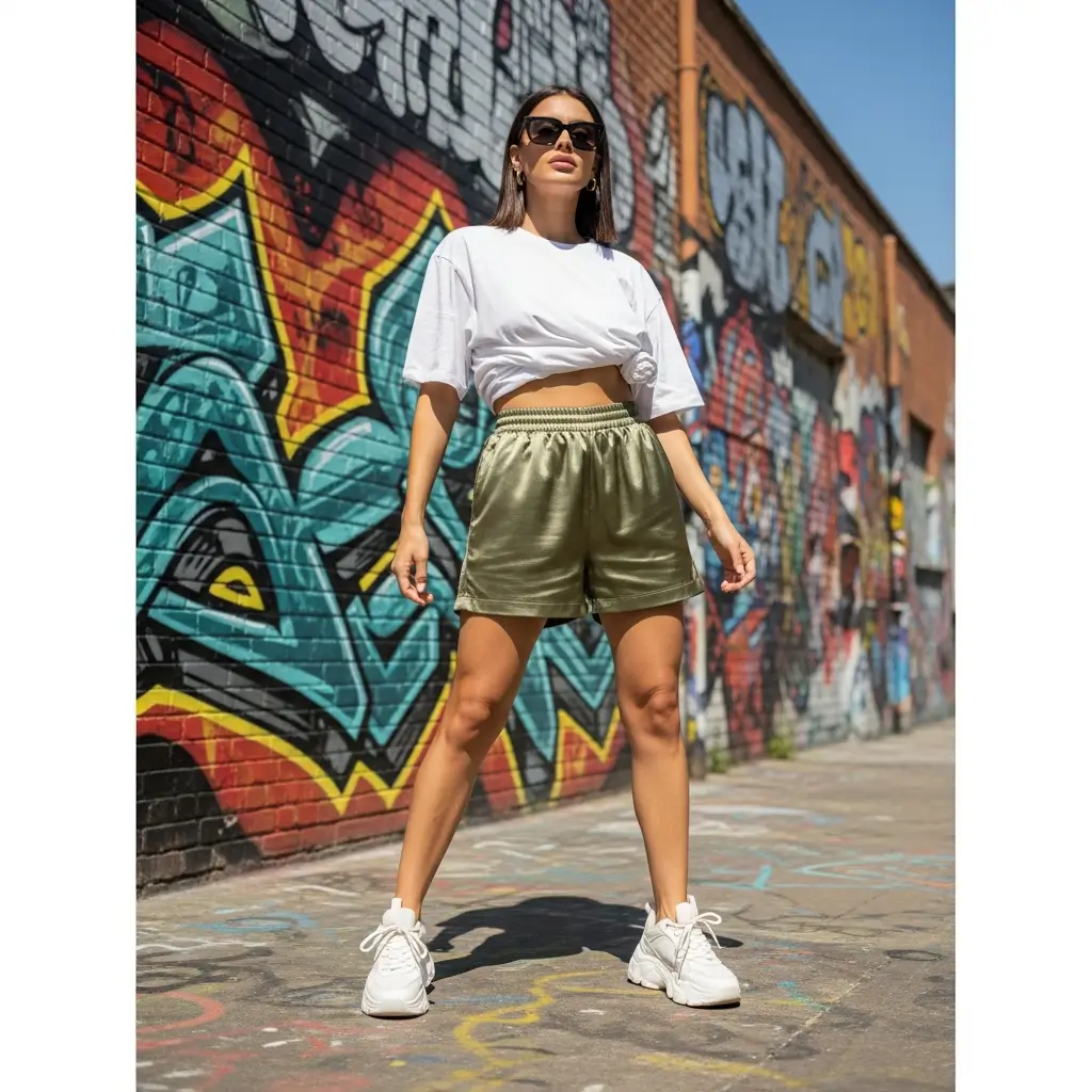 Want to elevate this further? I always add some chunky gold jewelry and maybe a structured mini bag. The accessories transform the whole outfit from “I just threw this on” to “I’m that girl who always looks effortlessly stylish.” Pro tip: half-tuck the tee or tie a small knot at the hem – it instantly defines your waist and makes the silk shorts look more intentional.